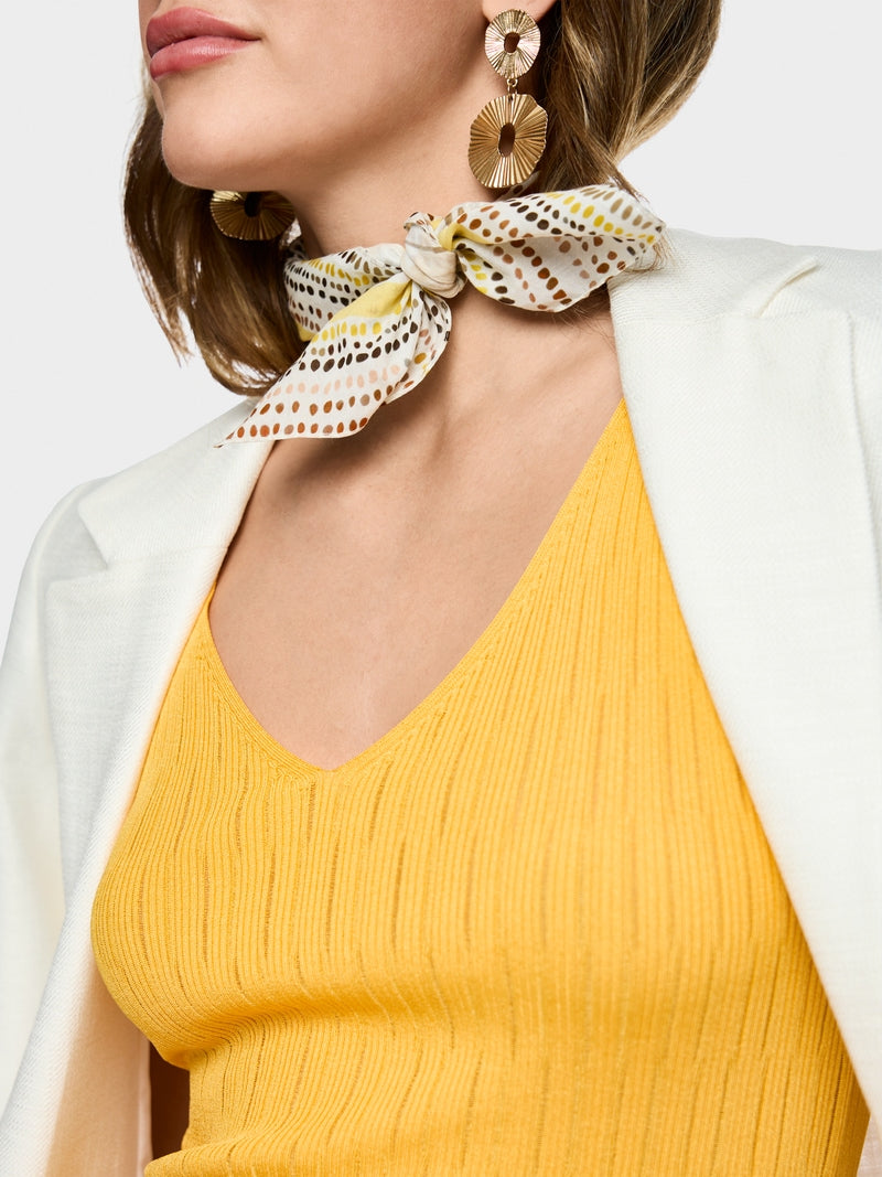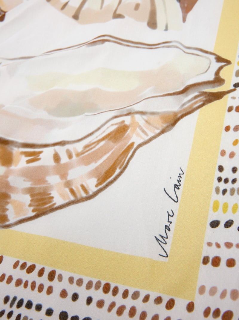 This square scarf made from a high-quality cotton-silk blend features a modern print of shells and dots. Light, soft and comfortable against the skin, it is a versatile accessory – whether tied elegantly around the neck or as a stylish eye-catcher on a handbag. Perfect for adding a fresh, summery touch to any outfit.