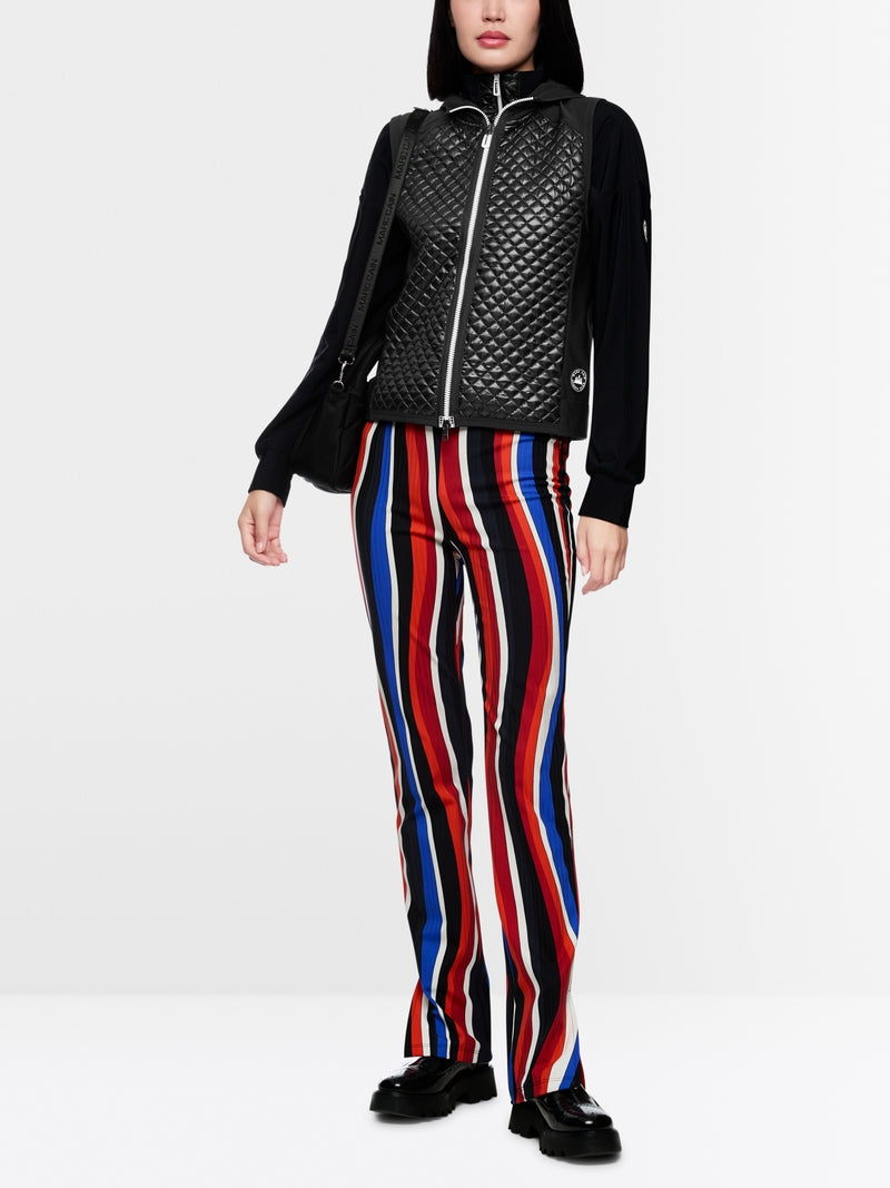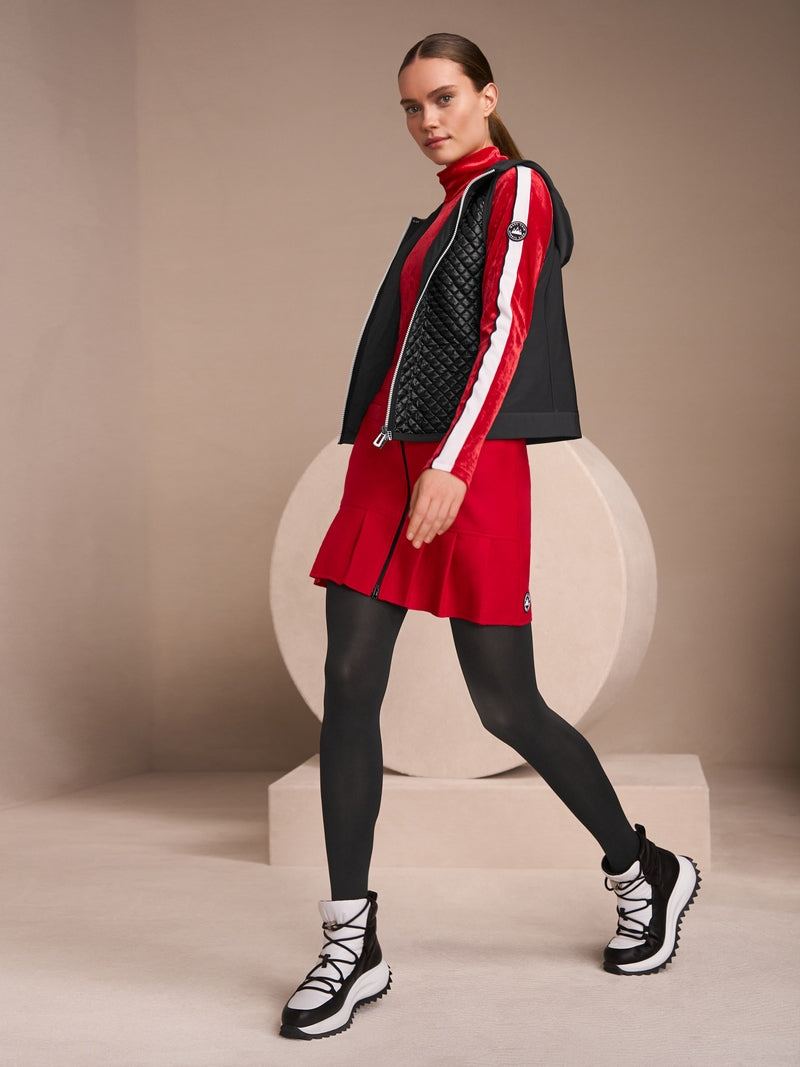 Sporty bodywarmer with a stand-up collar and attached hood. The front features a shiny lacquer look with a quilted diamond pattern. A striking two-way zip adds a modern contrast. Two side pockets provide functionality. Ideal for layered looks and versatile outdoor outfits.
