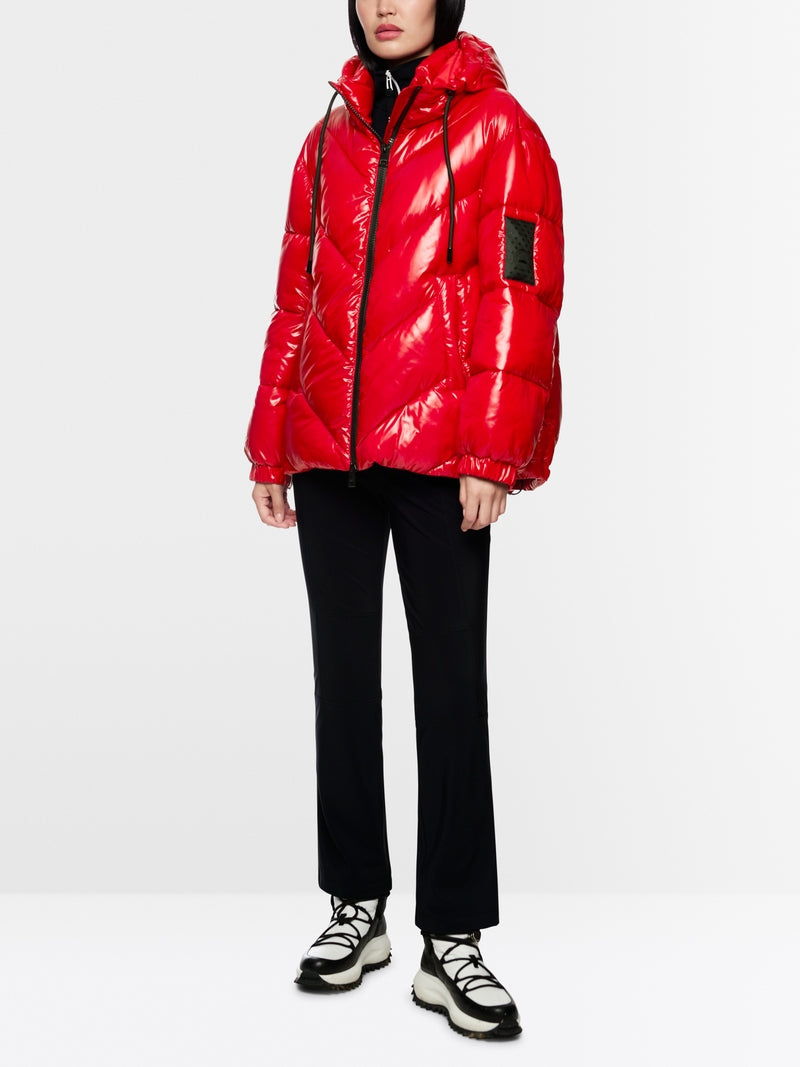 Padded outdoor jacket with a straight cut and a casual look. Its shiny surface gives this garment a modern touch. With a hood, full zip and a comfortable length, it is ideal for changeable weather. This jacket is made from recycled polyamide and features the Rethink Together sustainability label.