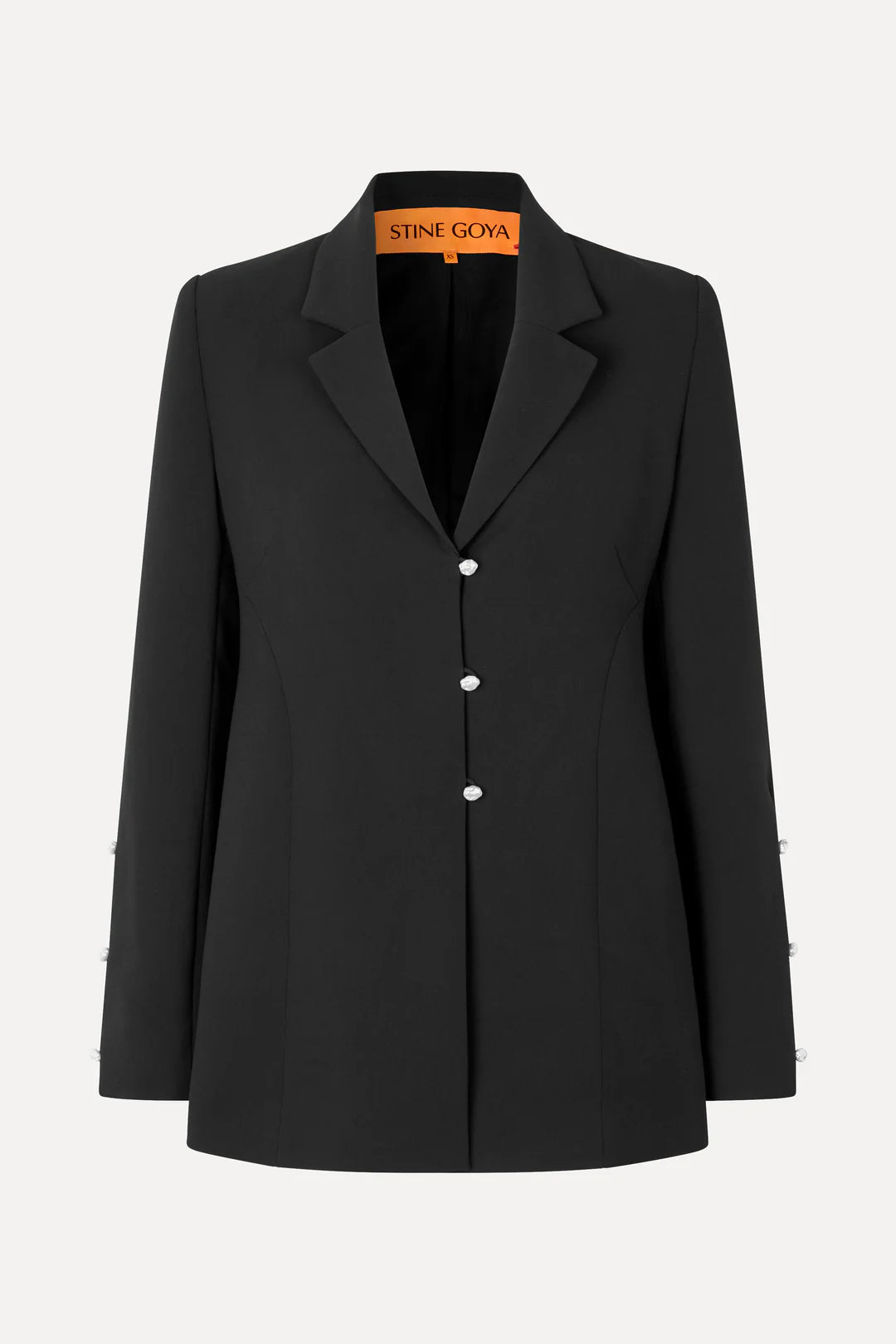 STRUCTURED BLAZER WITH A DOUBLE BREASTED CUT, LONG SLEEVES WITH SLITS AND PEARL BUTTONS. 100% RECYCLED POLYAMIDE. FULLY LINED. PAIR WITH THE SGISAAC PANTS IN JET BLACK.