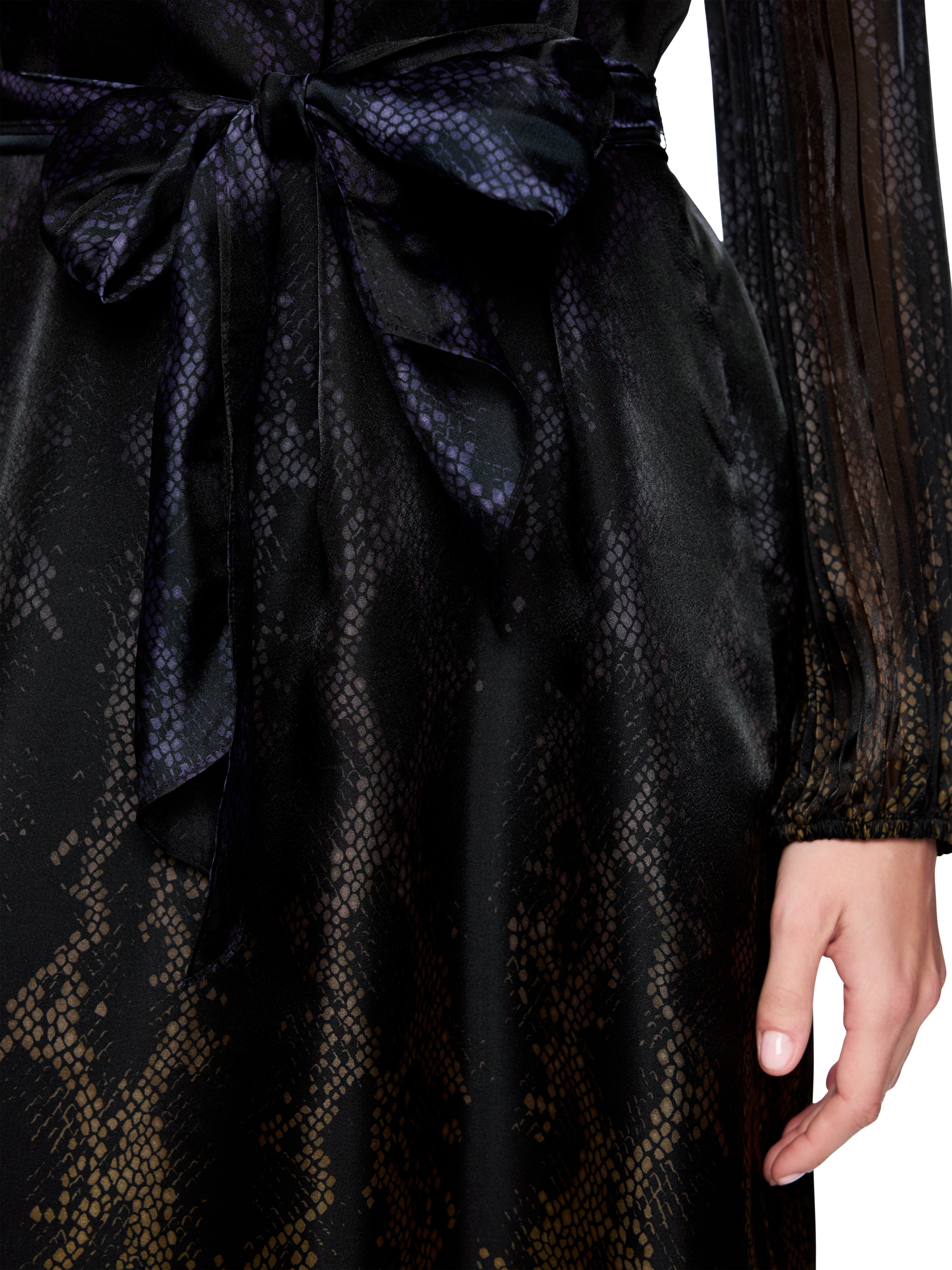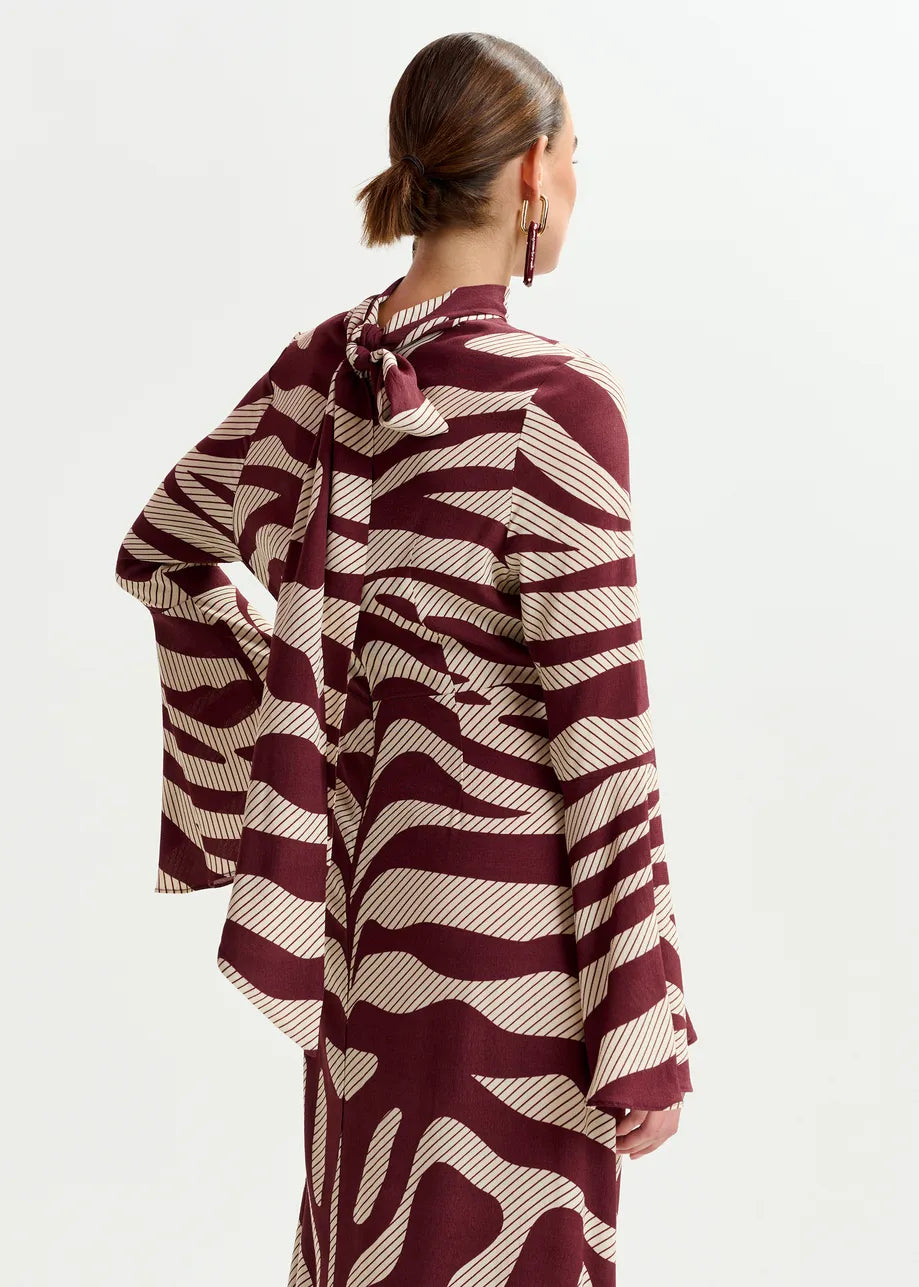 Essentiel Antwerp ISTRIPE Off-white and burgundy asymmetric zebraprint maxi dress with pussy bow tie