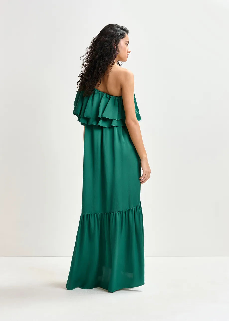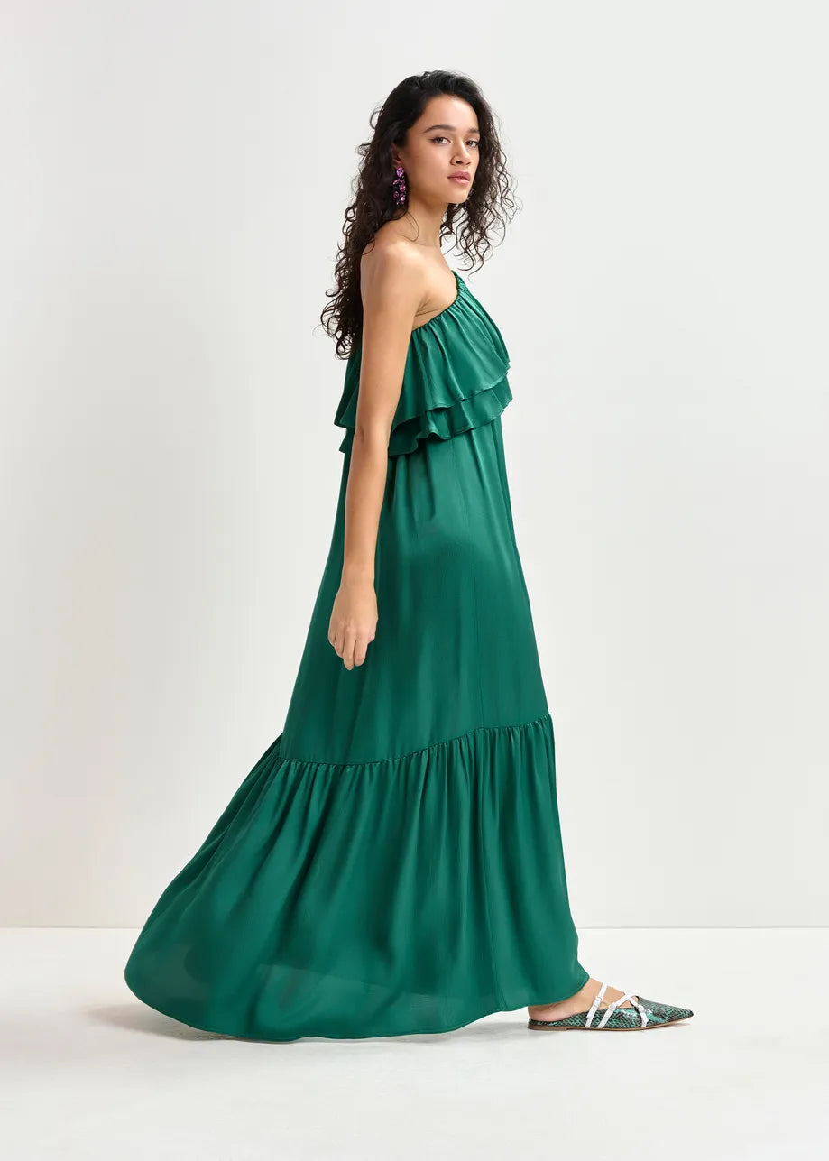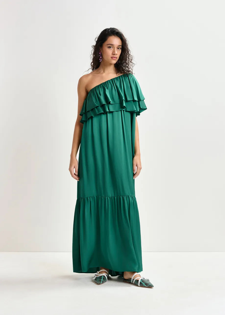 Essentiel Antwerp HOENIX Dark green one-shoulder maxi dress with ruflles and tiered hemline