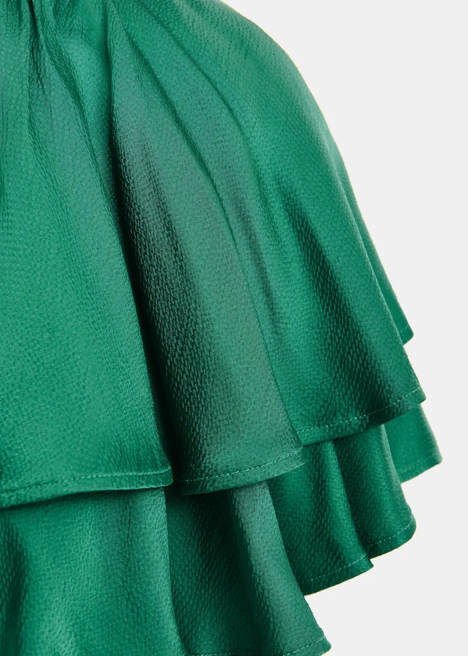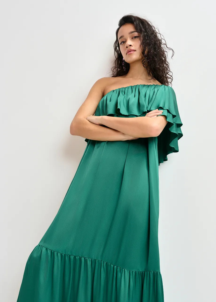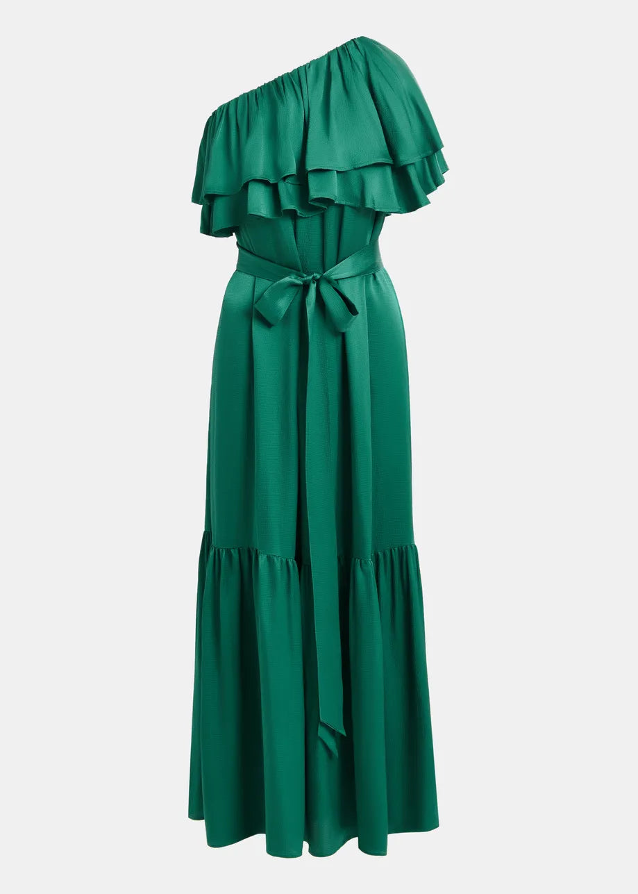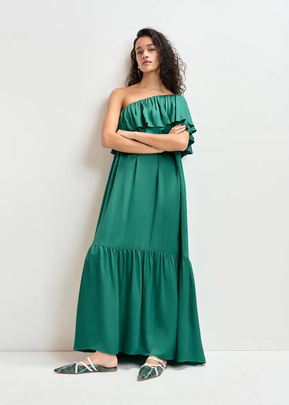 Essentiel Antwerp HOENIX Dark green one-shoulder maxi dress with ruflles and tiered hemline