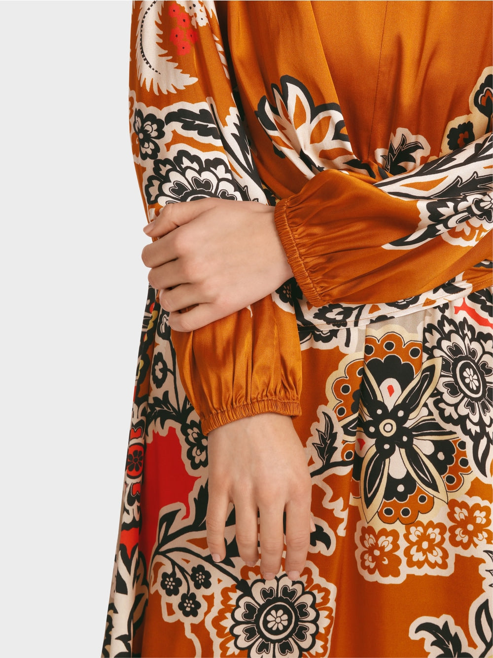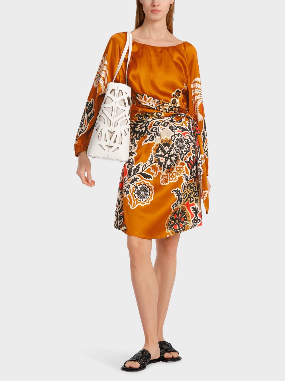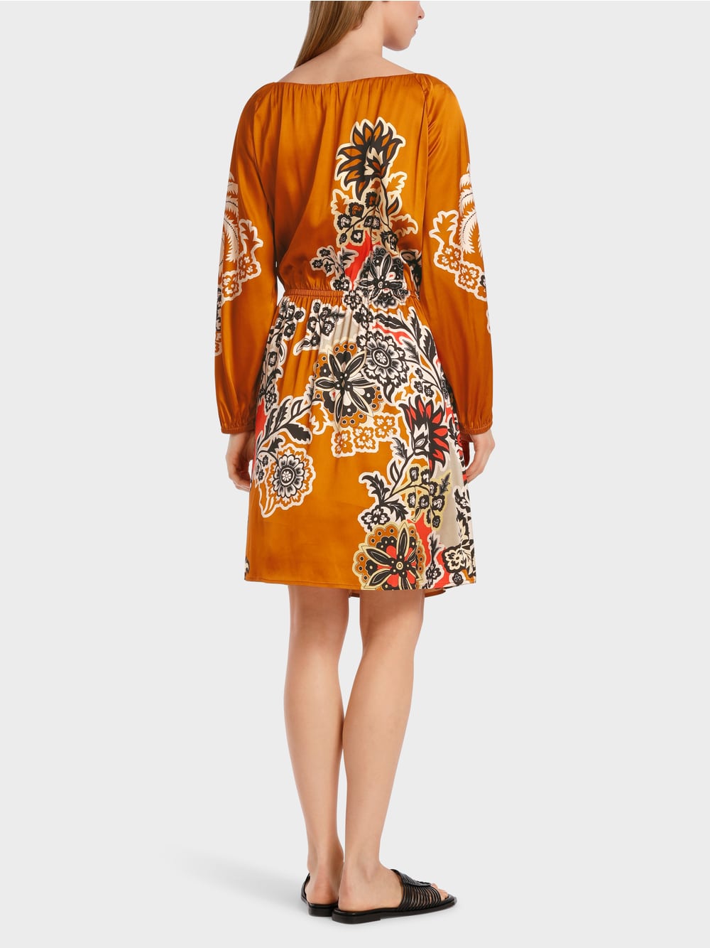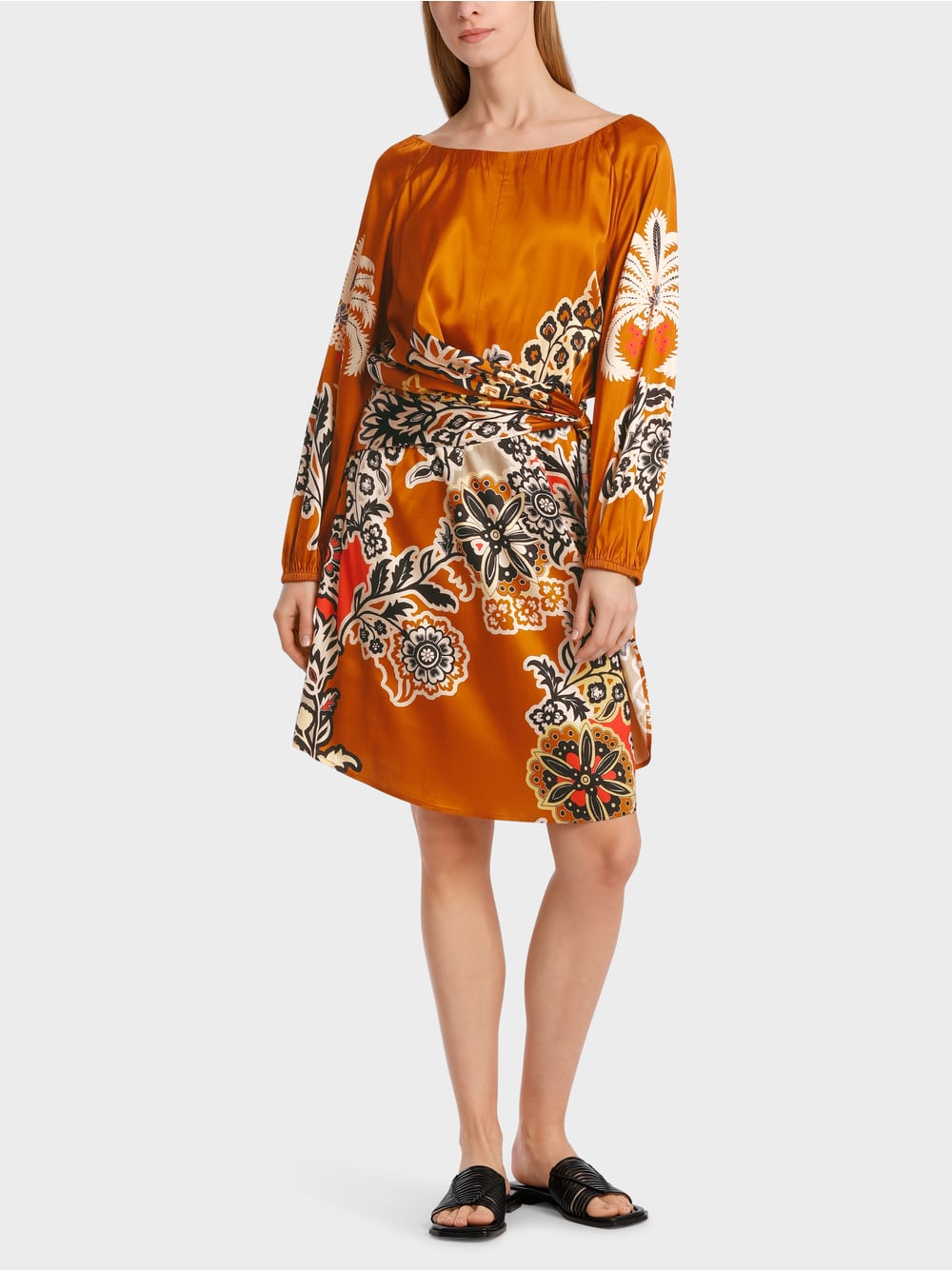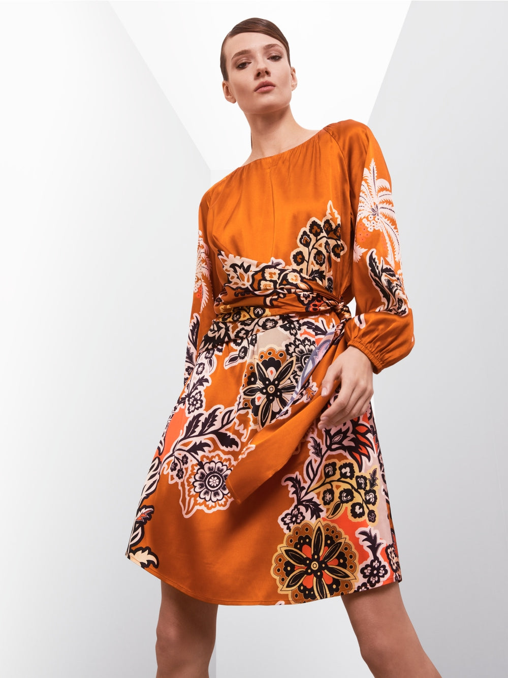 Dress made from soft flowing viscose. The silhouette is defined by an A-line, Carmen neckline and raglan sleeves. The back width is adjusted with an elastic band. The front features an asymmetrical wrap effect. The placed print is inspired by oriental floral ornaments.