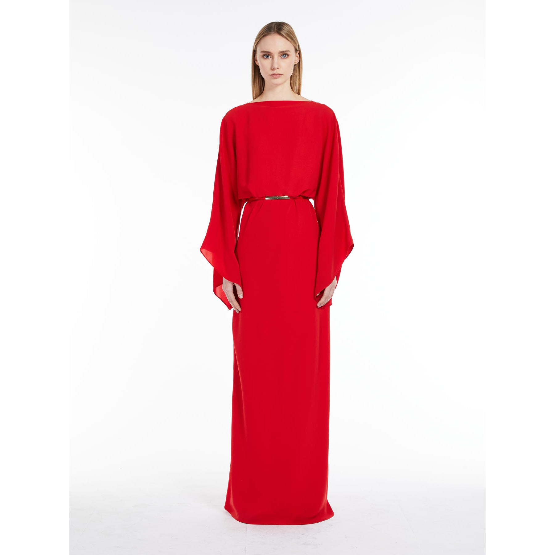 Long cady dress featuring a feminine silhouette with a boat neckline on the front, wide kimono sleeves and a deep V neck on the back. The patent-effect belt defines the waist. Length: 150 cm.