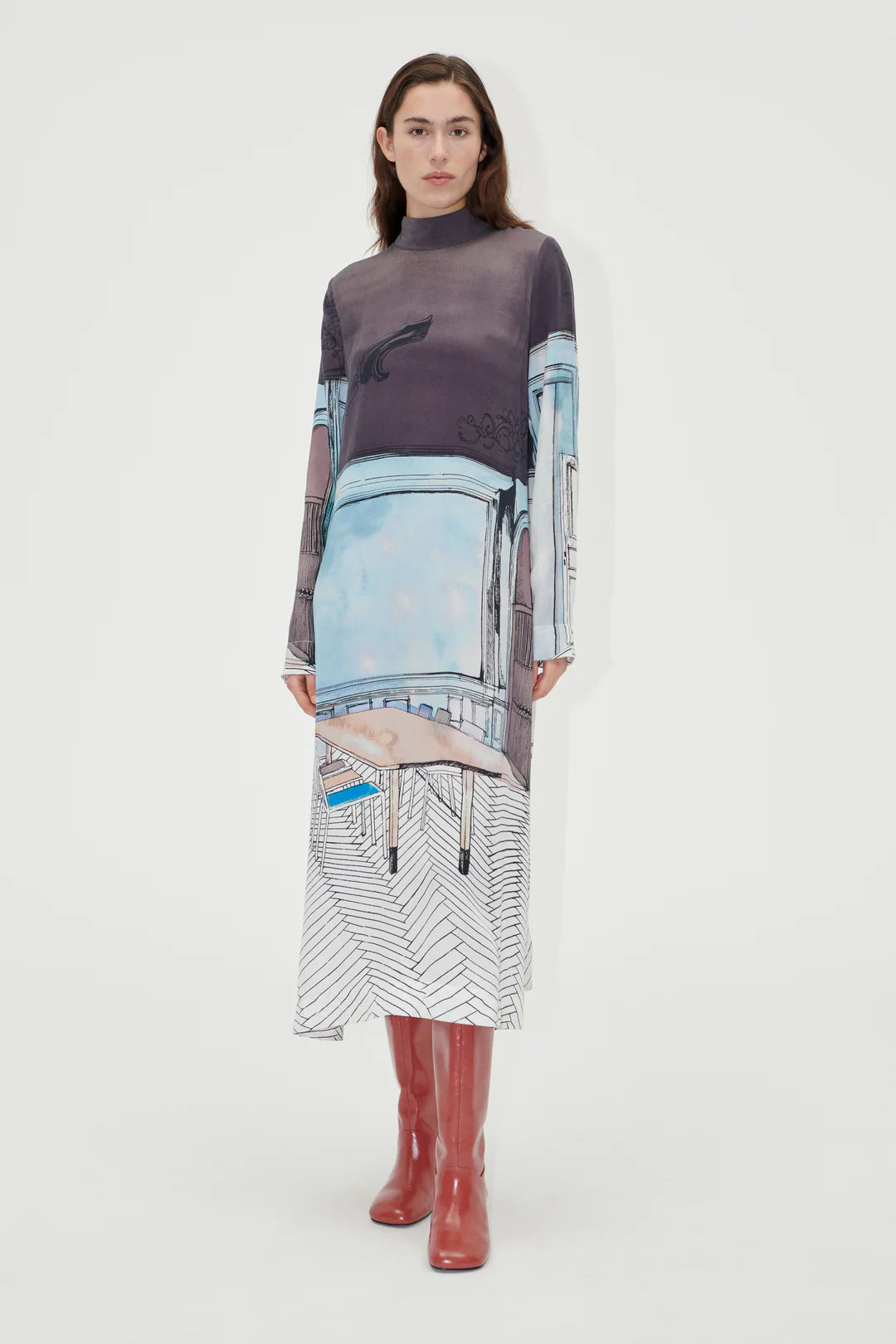Stine Goya Long Sleeve Midi Dress Fineline Blue Print