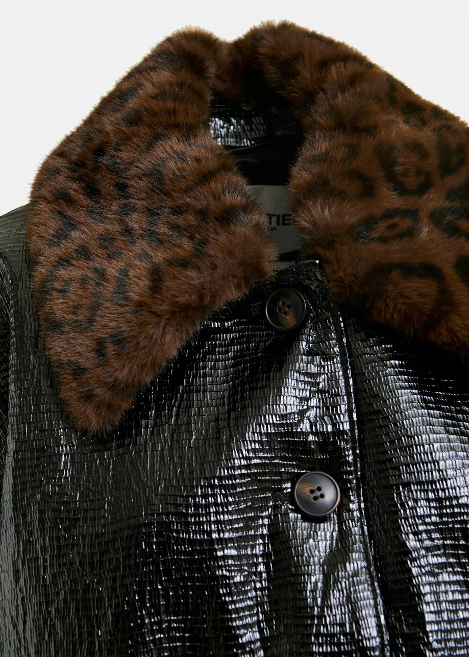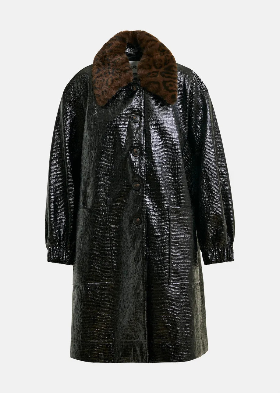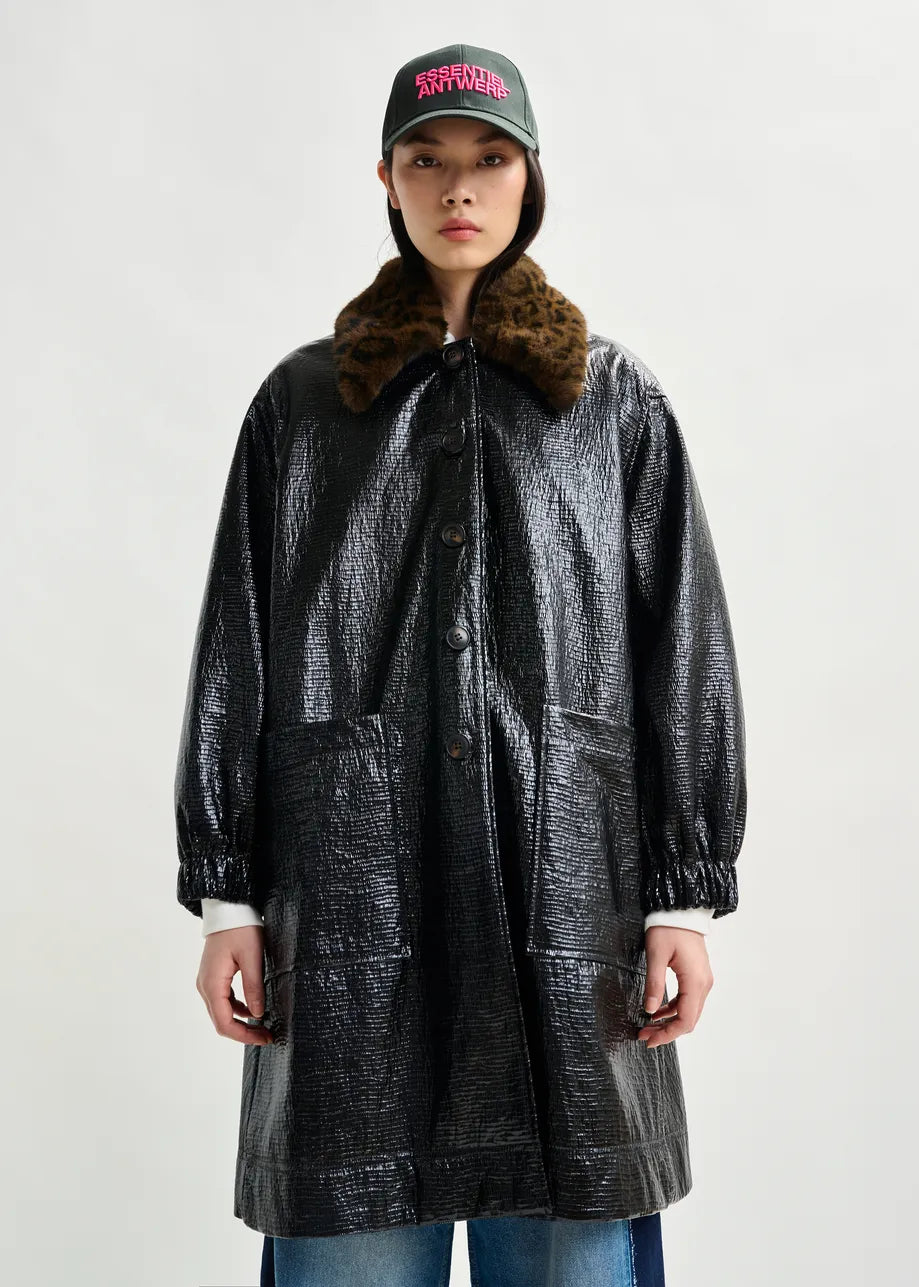 Essentiel Antwerp IOM Black glossy coat with removable leopard print faux fur collar