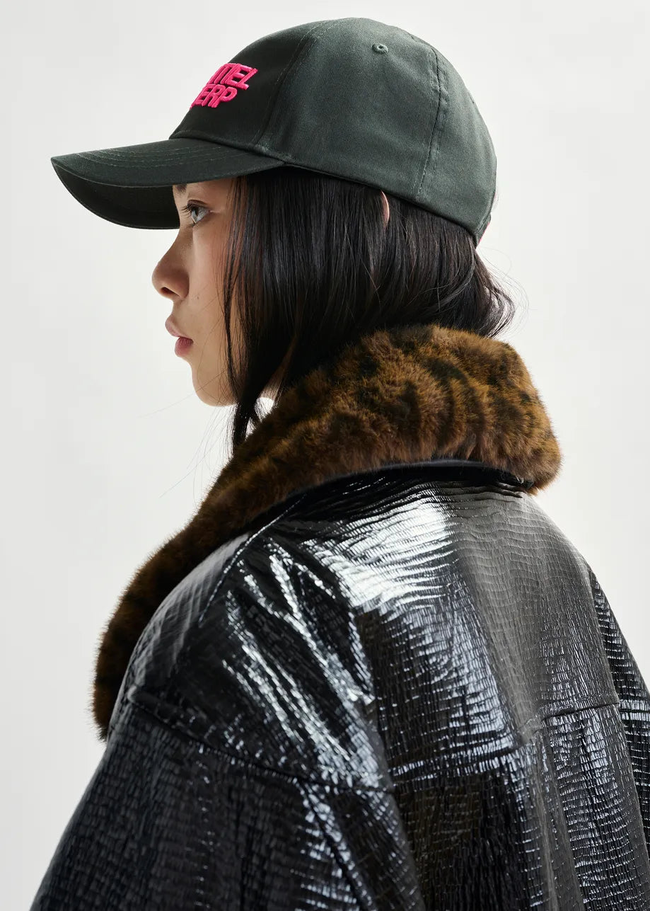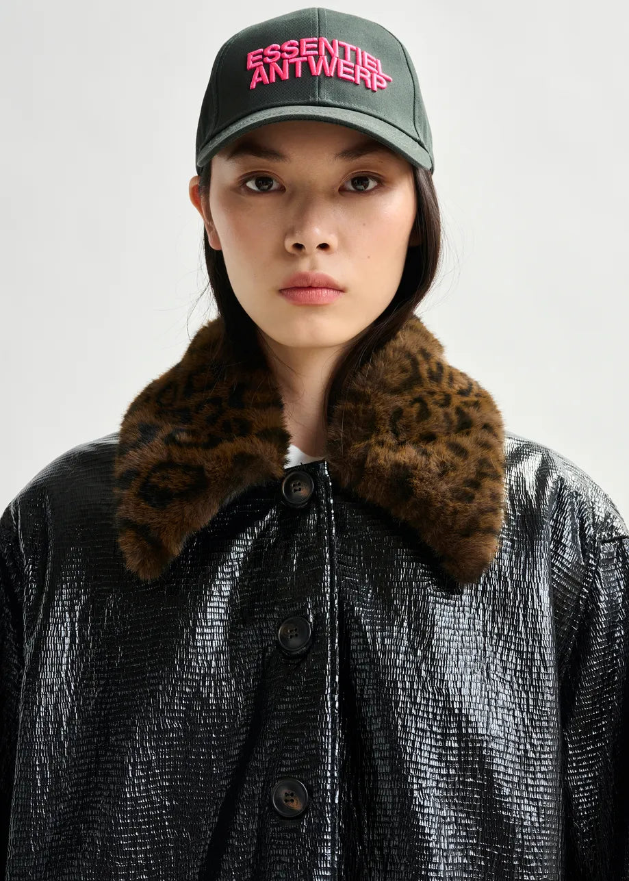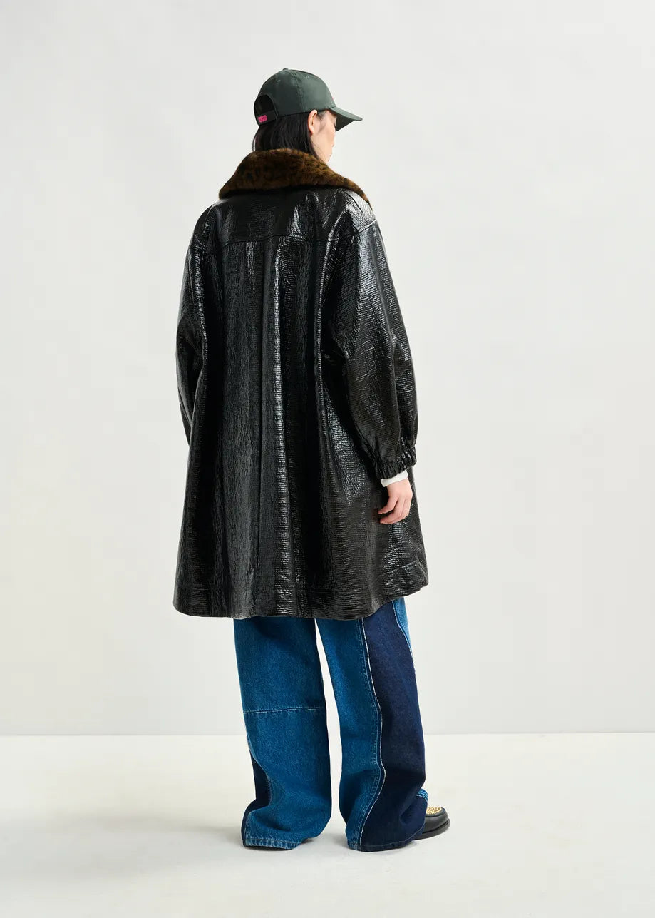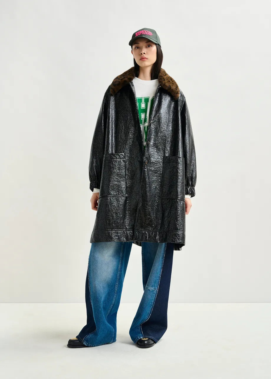 Essentiel Antwerp IOM Black glossy coat with removable leopard print faux fur collar