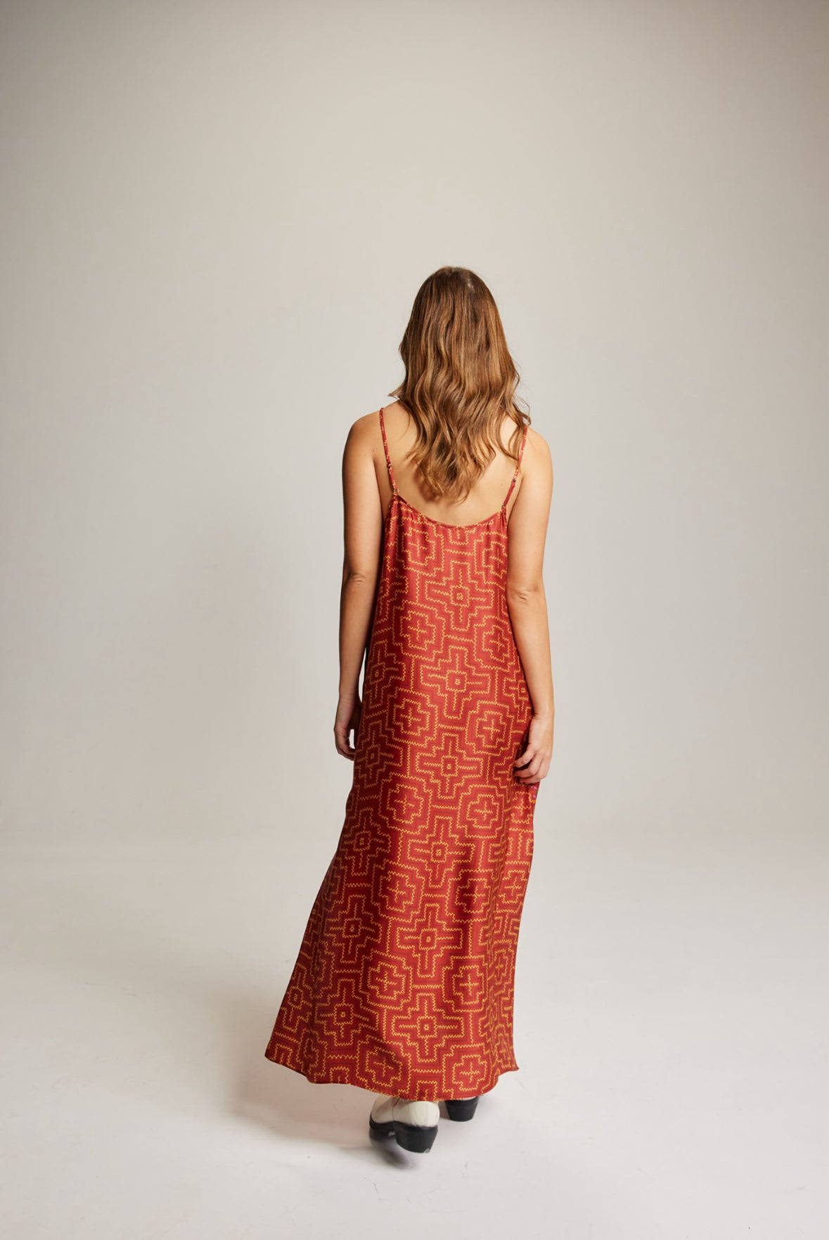 Maxi length camisole dress with V-neck and spaghetti straps. Side slits. Dress it up or down for day or night. Easy to wear, feminine look.