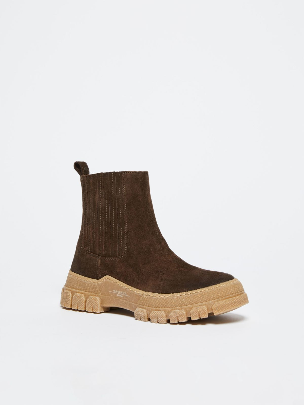 Ankle boots in brushed split leather with blackened finish. The Chelsea boot style stretch wool inserts on the sides and the loop on the back allow them to be put on quickly and comfortably. Rubber sole with notched detailing. Featuring a logo on the bottom.