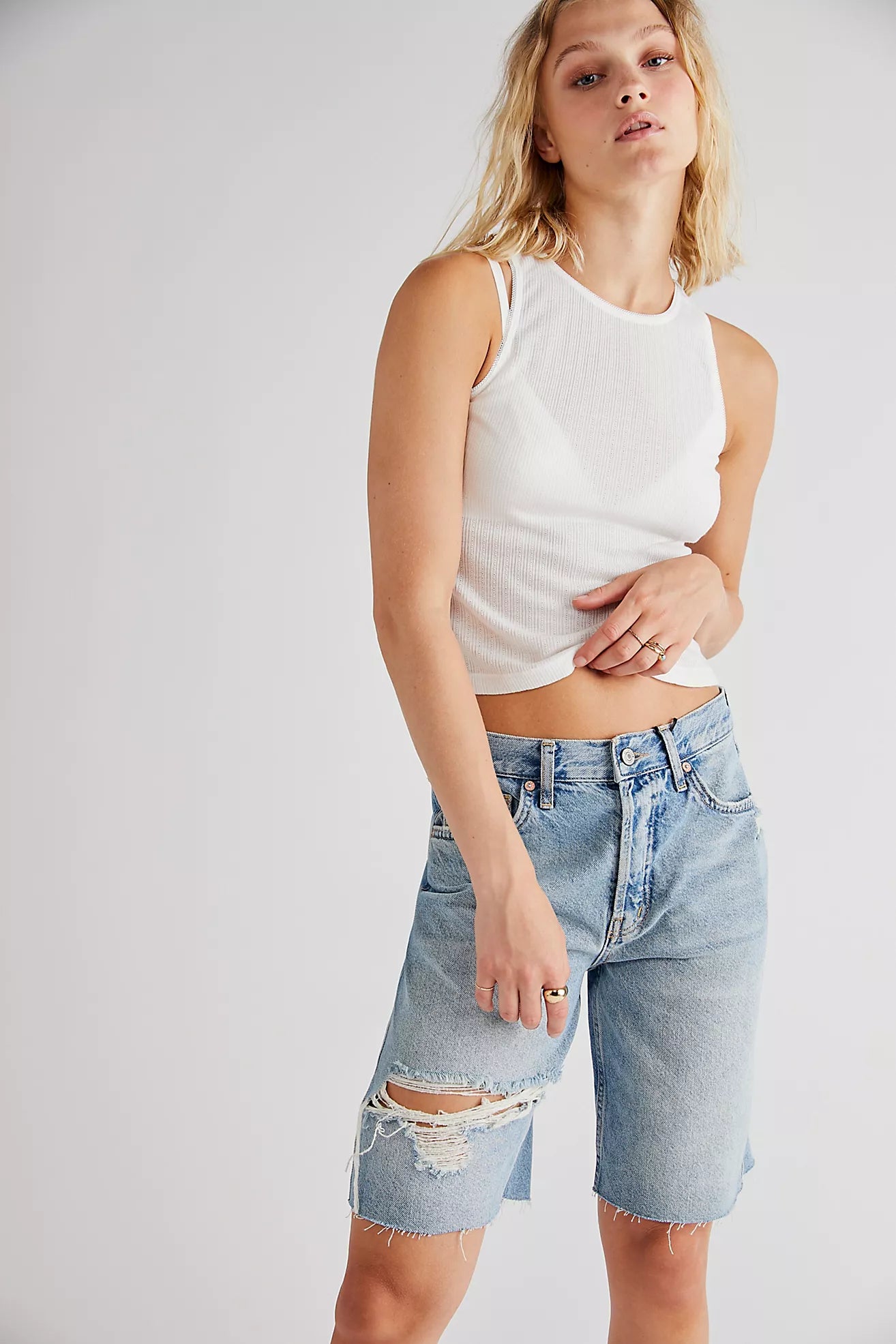 Perfectly distressed and just as cool, these boyfriend-style shorts from our We The Free collection are featured in a high-rise, slouchy silhouette with exaggerated distressing in a mid-length cut.