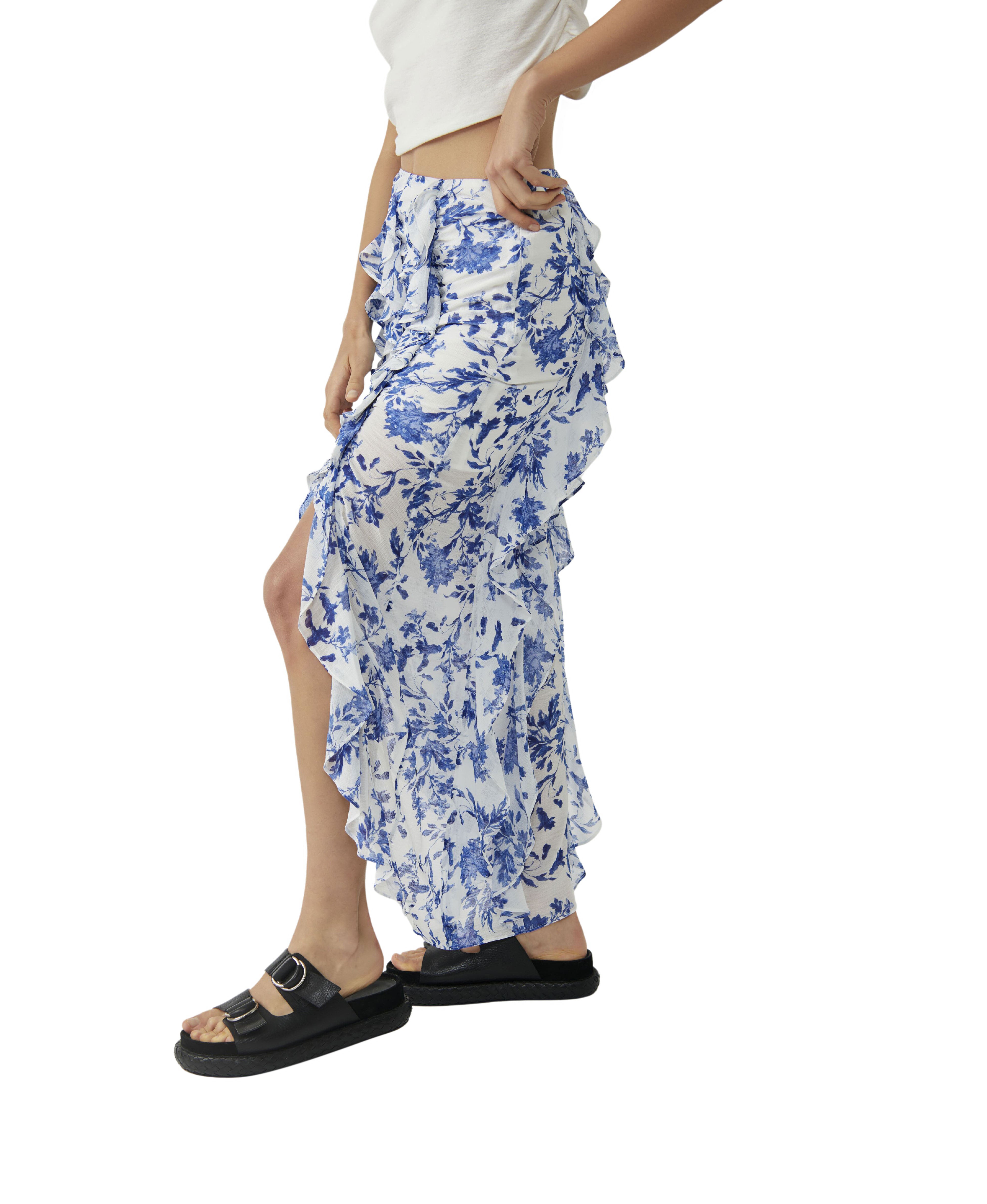 Features: Ruffle trimming, asymmetrical hemline, ruched paneling, vintage-inspired floral print, hidden zip closure
