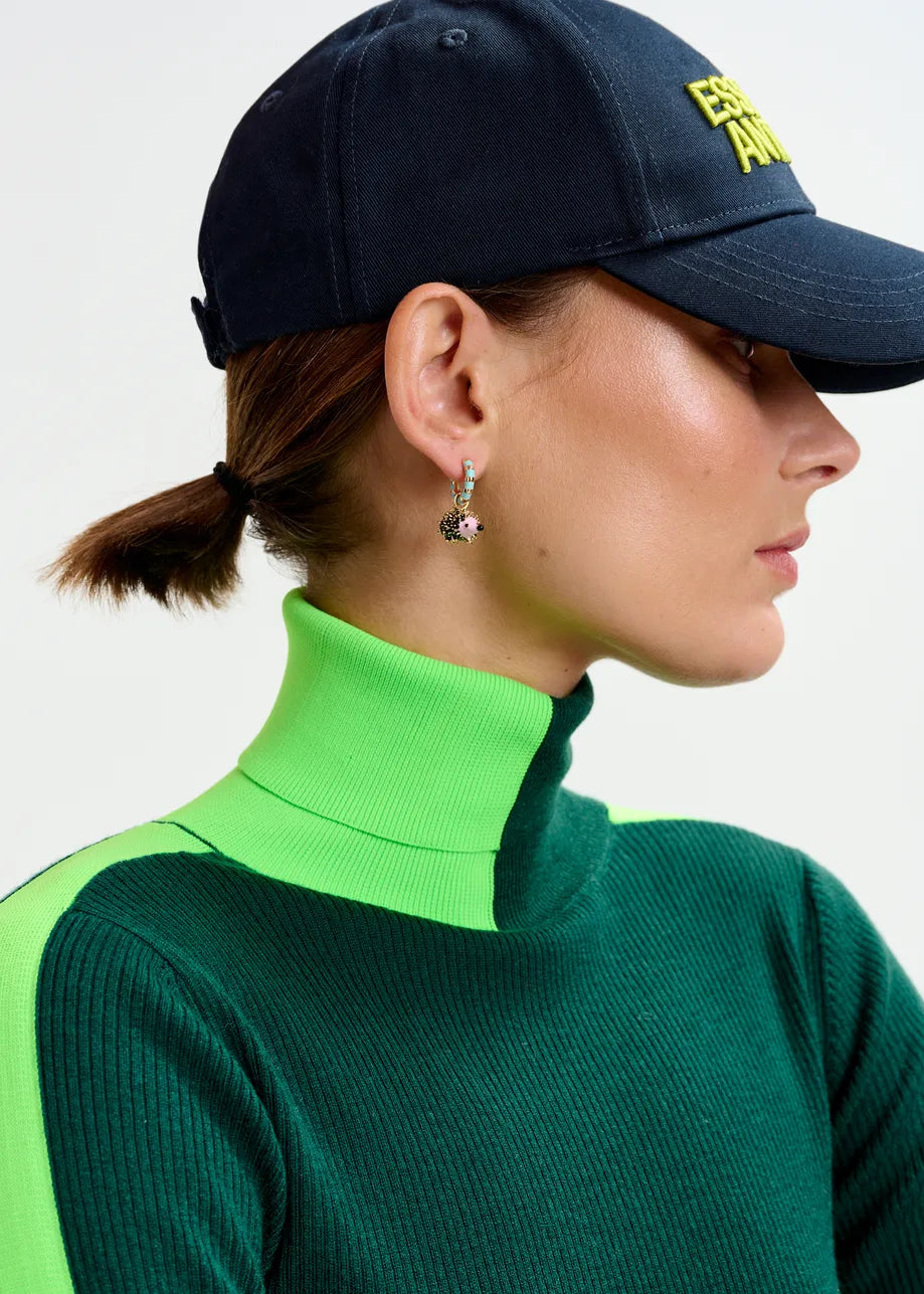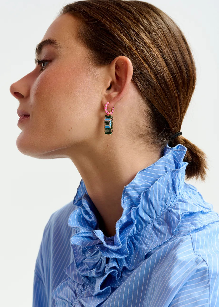 Essentiel Antwerp ISTOLI Gold and blue hoop earrings with dinosaur and strawberry pendants