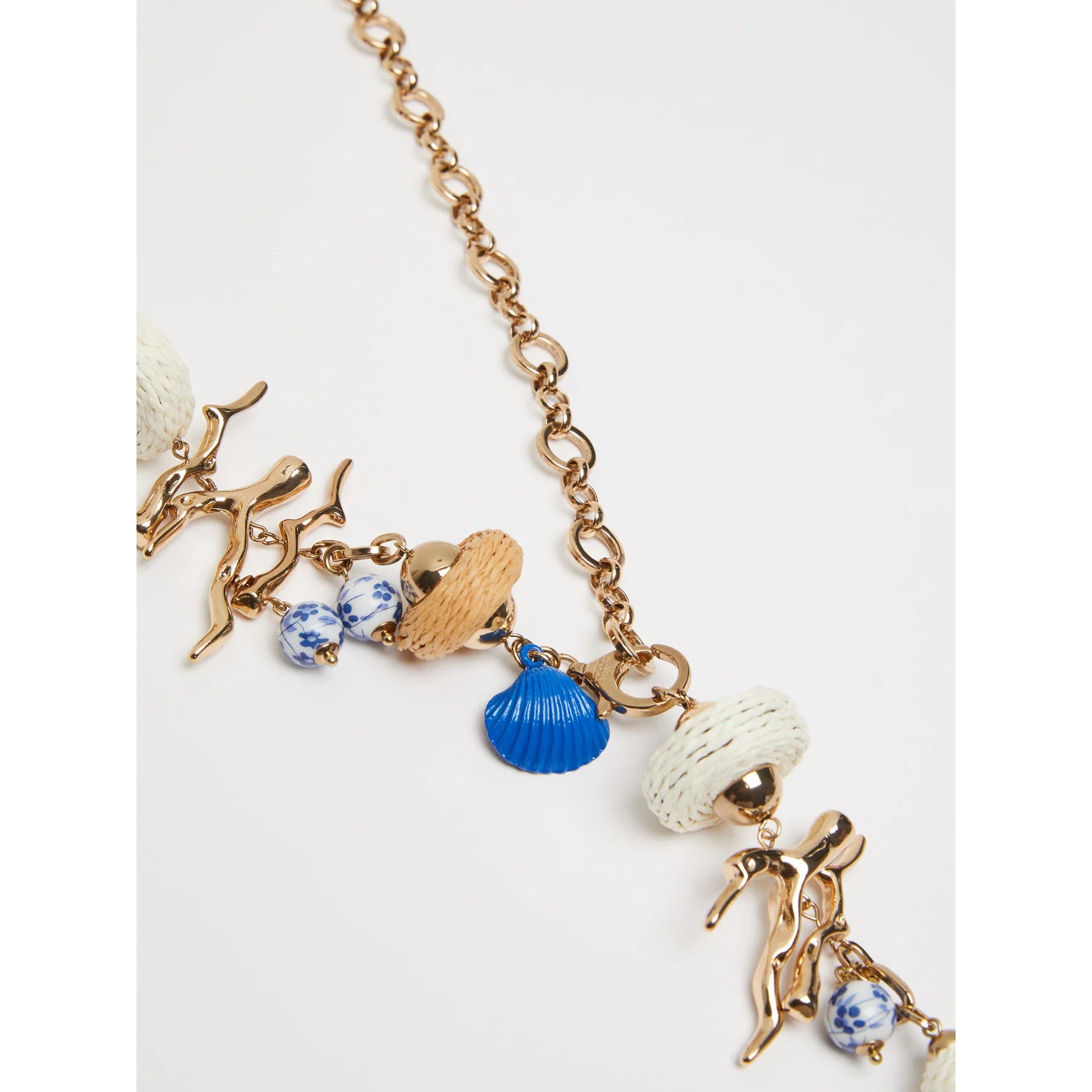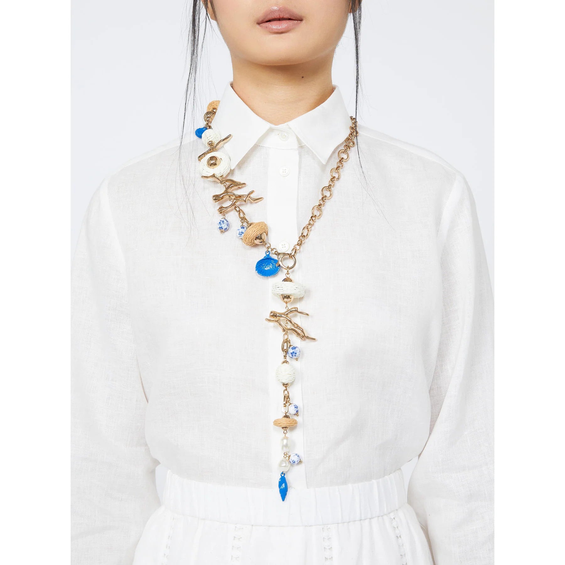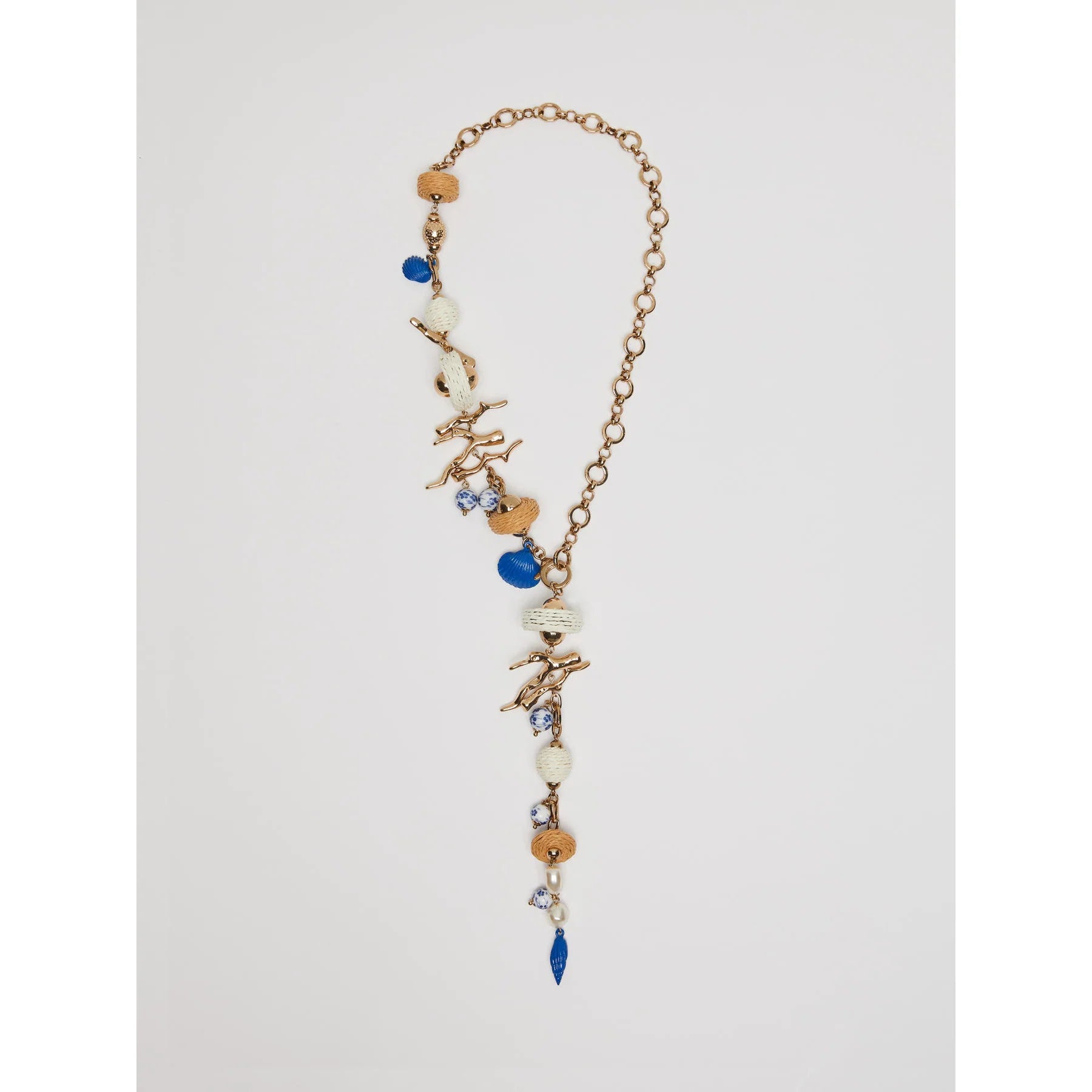 Lariat necklace adorned with ceramic, viscose and resin elements.