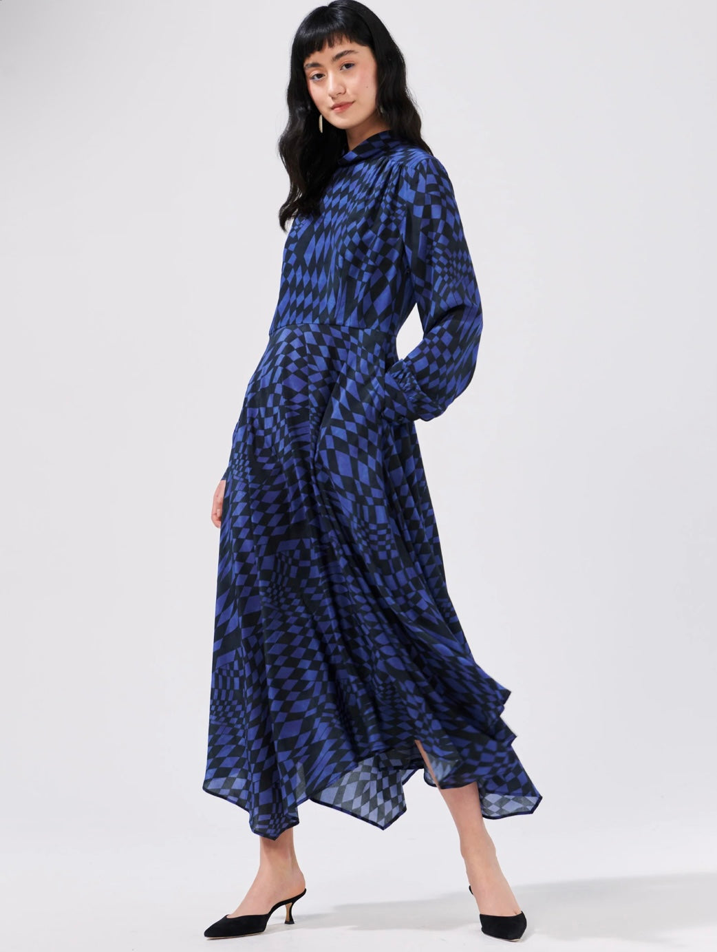 Hayley Menzies ABSTRACT CHECK HANDKERCHIEF HEM SILK MIDI DRESS