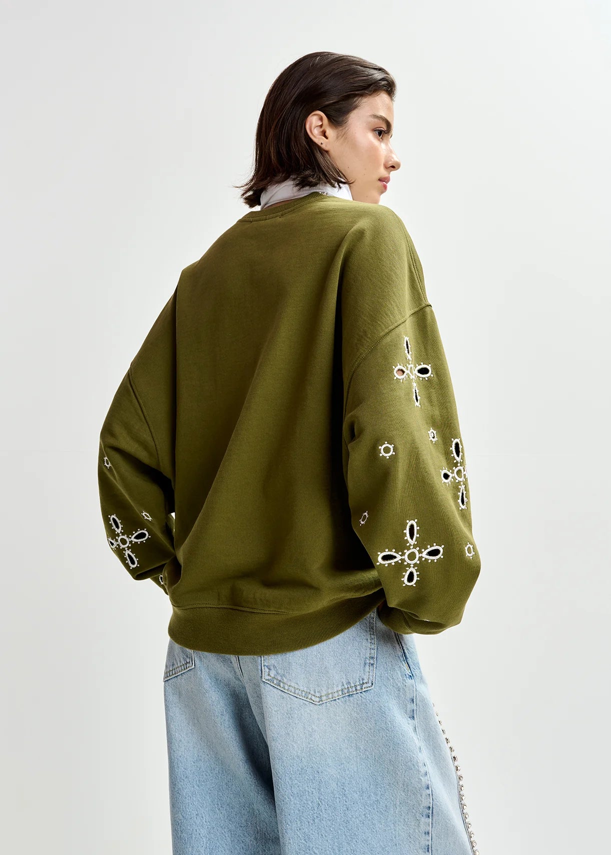 Essentiel Antwerp Khaki cotton sweatshirt with white flower embroideries