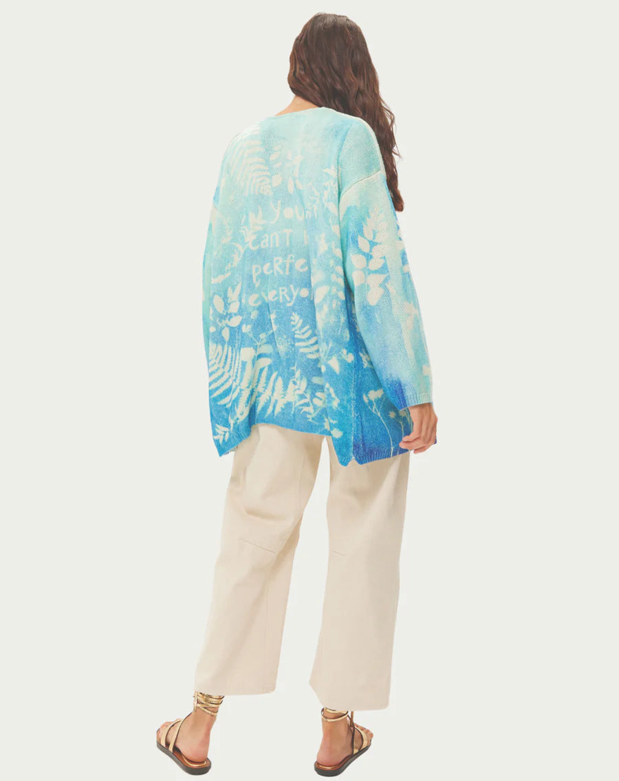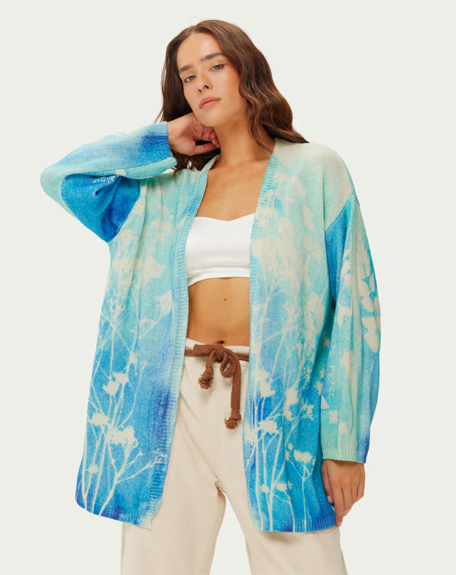 Layer in effortless style. This lightweight cardigan features a stunning gradient from soft mint to deep indigo, adorned with delicate botanical prints. The relaxed open-front silhouette and long sleeves create the perfect versatile layer.