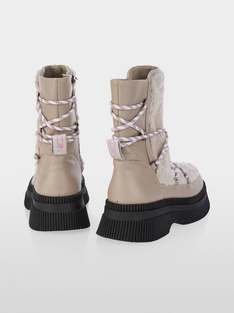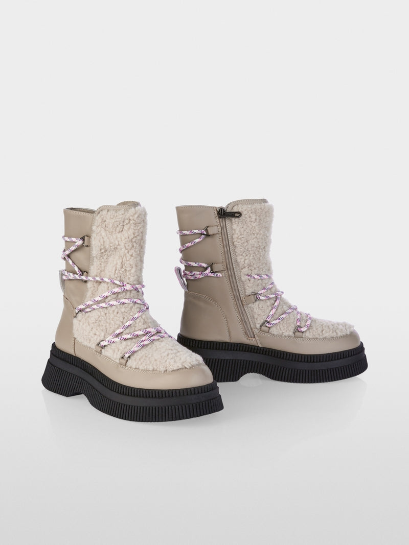 A trendy combination of materials defines the look of these striking ankle boots. They feature teddy fun fur on the front and calf leather at the heel. The distinctive sole in riffled design and rounded shape also stands out. The extravagant lacing tying the front and back together adds to the unique style.