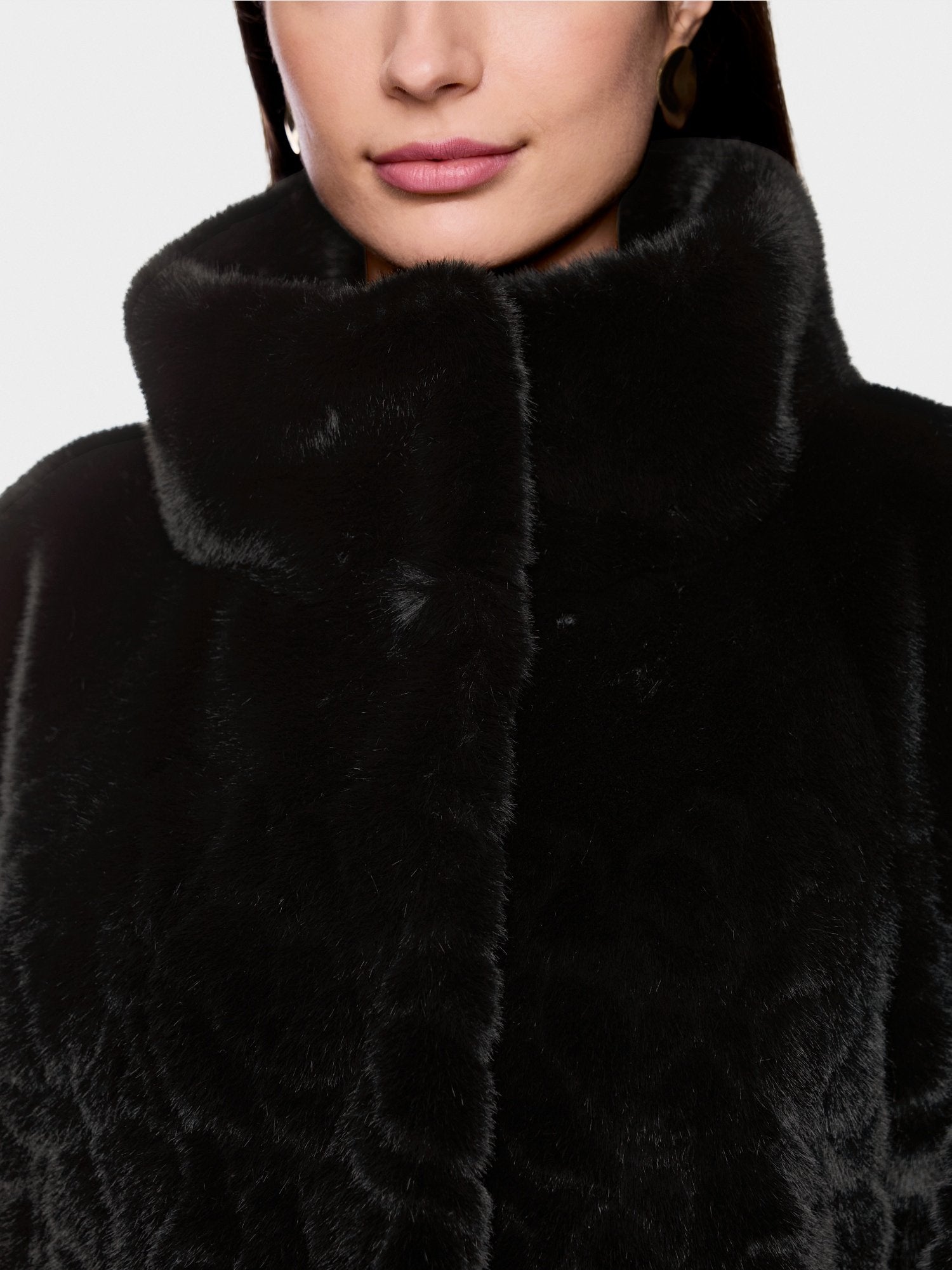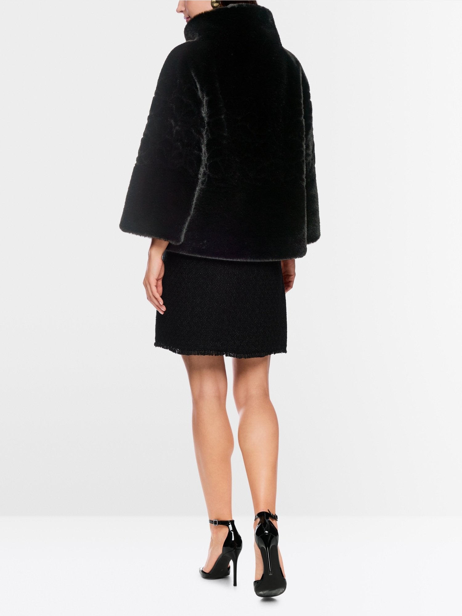 This jacket stands out thanks to its trim featuring elegant faux fur, which gives it a very soft feel. It comes with a light stand-up collar, wide sleeves and a flared cut. This jacket is lined on the inside for comfort. The side pockets are a practical detail. It fastens with press studs.