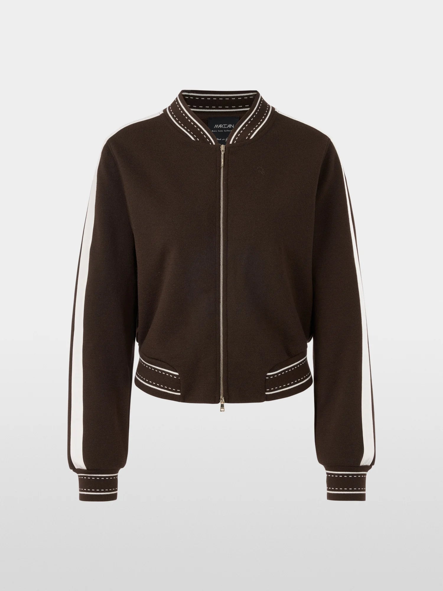 Fine knit cardigan with contrasting striped highlights. It fastens with a zip. This cardigan has a loose fit with shaping ribbed cuffs and hem. This garment is Knitted in Germany: the yarns are knitted on state-of-the-art knitting machines and the fabrics are finished in Germany. The individual parts, such as the sleeves and front, are sewn together in European partner companies.