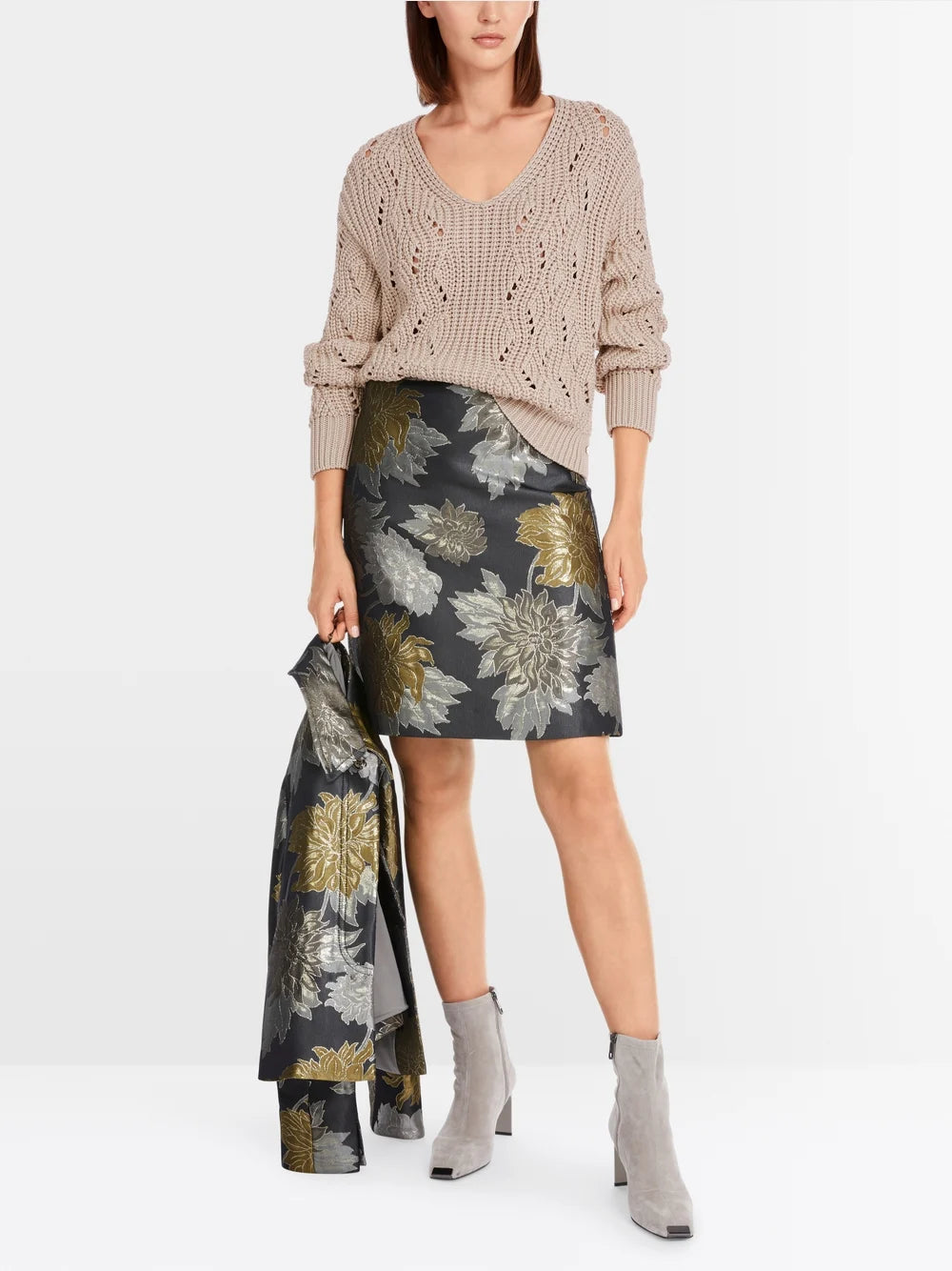 This chunky knit pullover is a casual basic with a lace pattern design. It has a wide shape and a V-neck. This sweater is knitted and finished in a soft material mix with viscose in Germany. The individual parts are further processed in European partner companies. This garment is therefore “Knitted in Germany”.