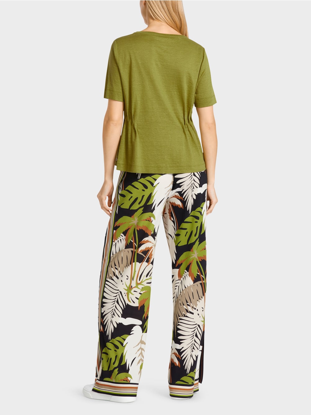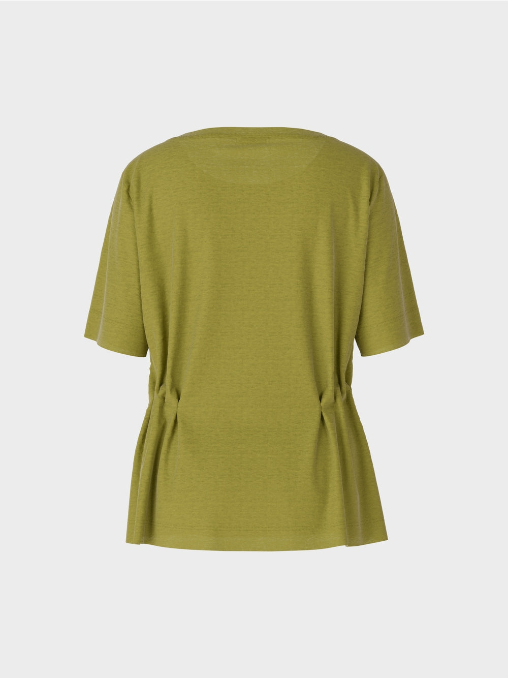 This T-shirt is predominantly made from linen and the jersey has a typical irregular texture. The feminine aspect comes from the smocked pleating at the waist.