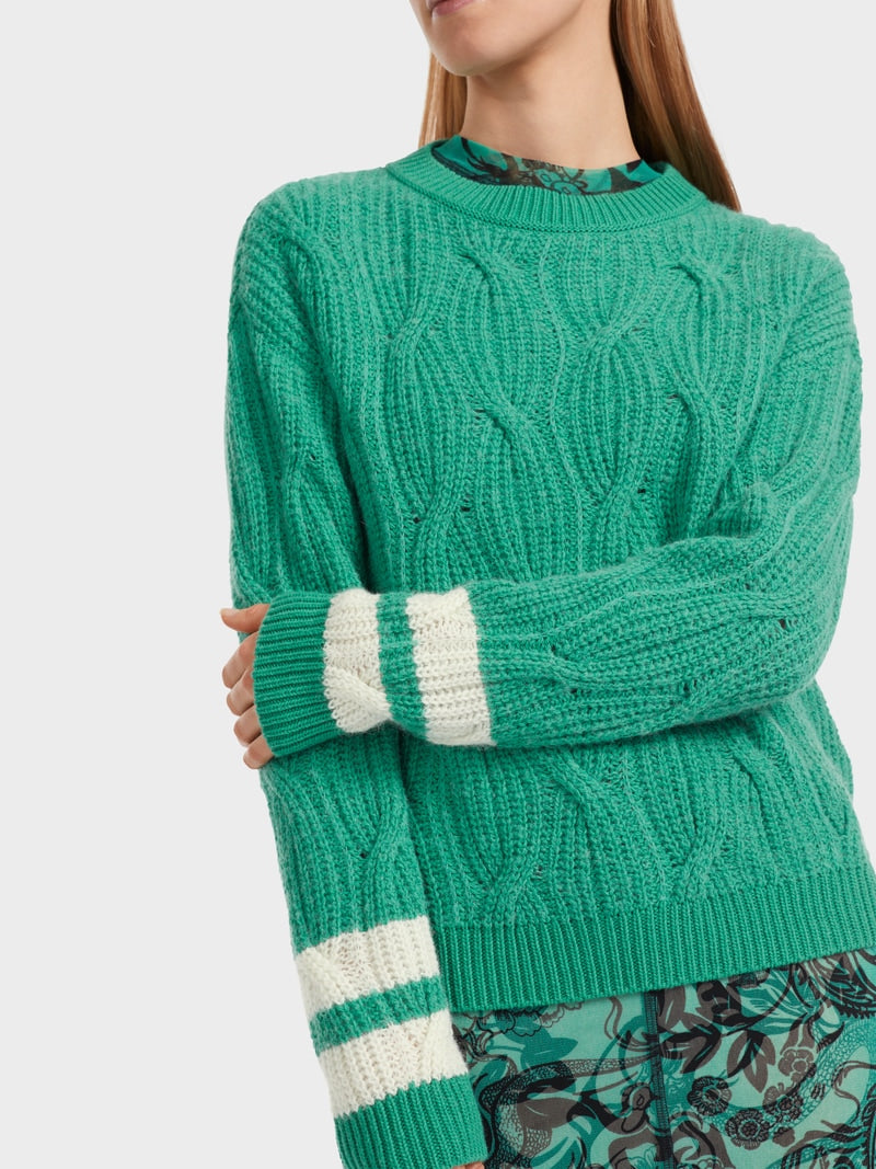The sweater is characterised by softness and lightness - due to the fine yarn and the loose knit. The design finds its moment in the stylised braids in the front and sleeves. The back is knitted in a patent pattern. The sweater is "Knitted in Germany": It is knitted and embellished in Germany using the latest technologies. The individual parts, such as the back and sleeves etc., are sewn together in European partner companies.