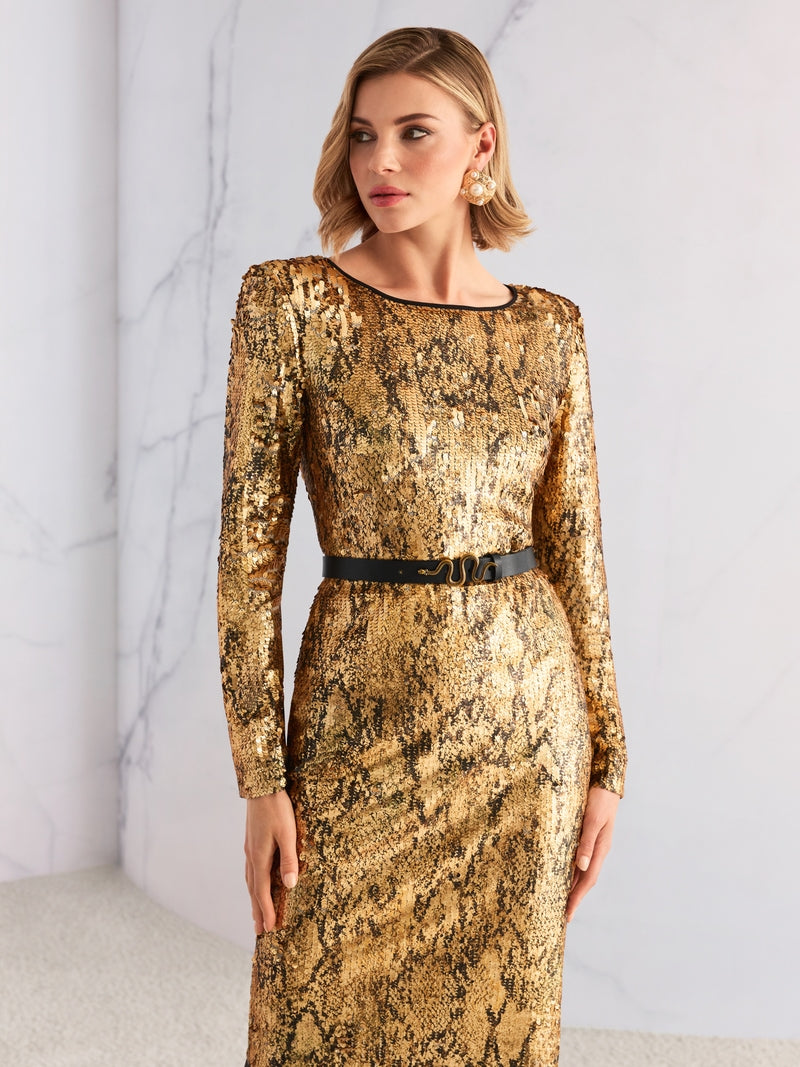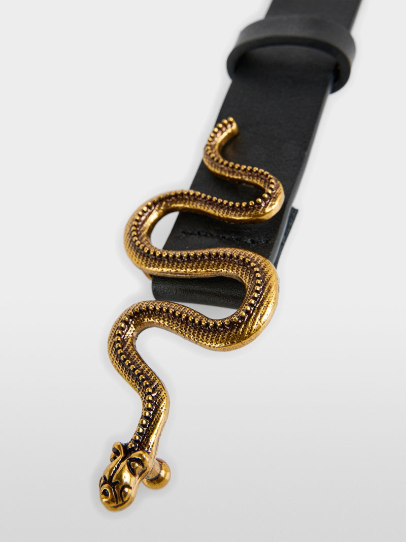 Elegant, narrow waist belt made of high-quality leather with an exclusive metal buckle in the shape of a golden snake. This stylish accessory emphasises the waist and gives outfits from dresses through to blouses a sophisticated, modern look.