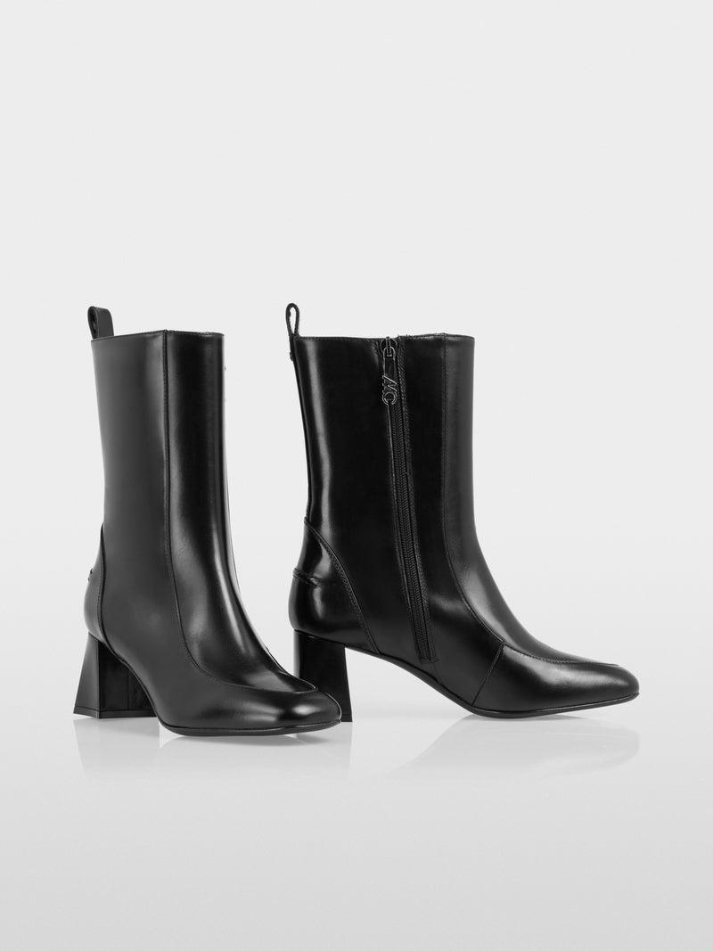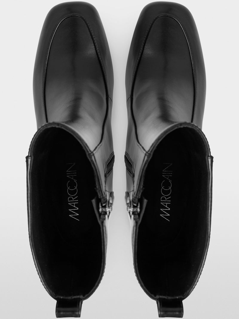 Seventies-inspired bootie made from calfskin. Characterized by the square toe and trapezoid block heel. The heel is reinforced and accentuated with decorative stitching. The bootie fastens with a full-length zip on the inside. These booties are produced responsibly and bears the "Rethink Together" sustainability label.