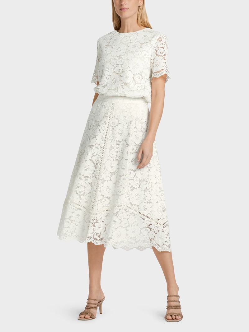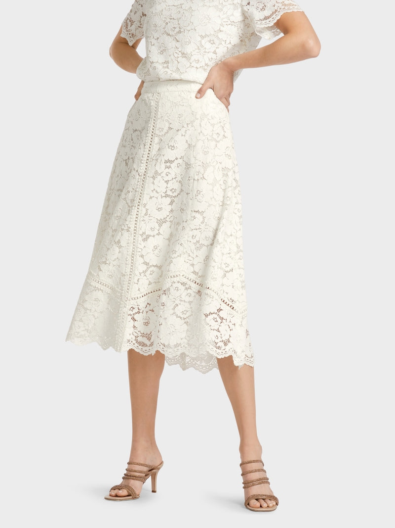 This skirt is classically finished with a waistband and zip. The wide, swinging shape is created in panels with contrasting lace integrated into the seams. This makes the cut part of the design. The lining is partial and the hem is see-through.