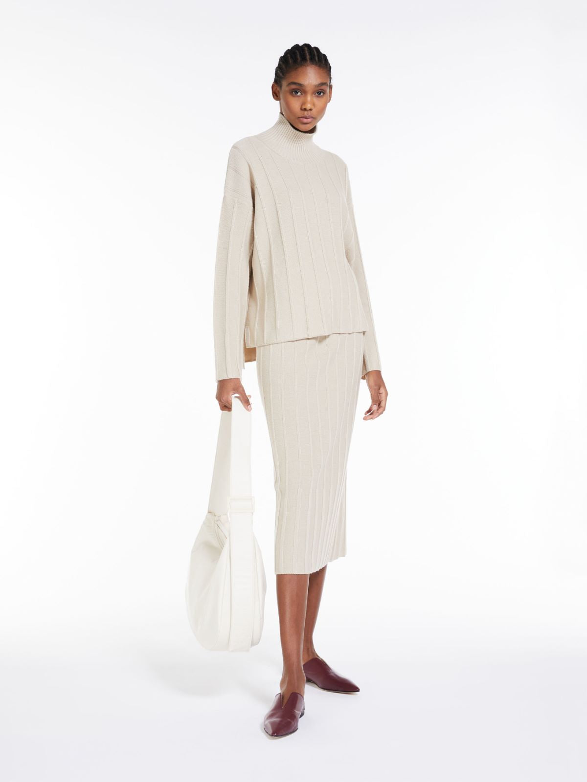 Straight-cut midi skirt in pure wool yarn with reverse flat ribbing, elasticated waist and central slit on the back. Length: 82 cm.