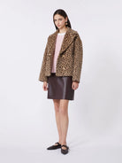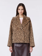 Double-breasted pea-style coat with a spotted pattern.