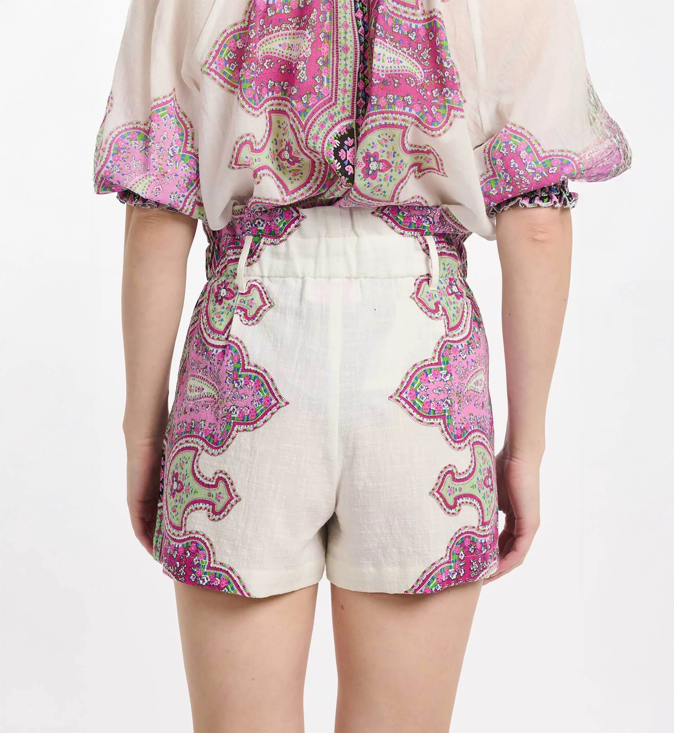 - Placed Paisley print in fuchsia pink and ecru shades