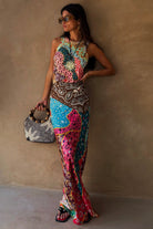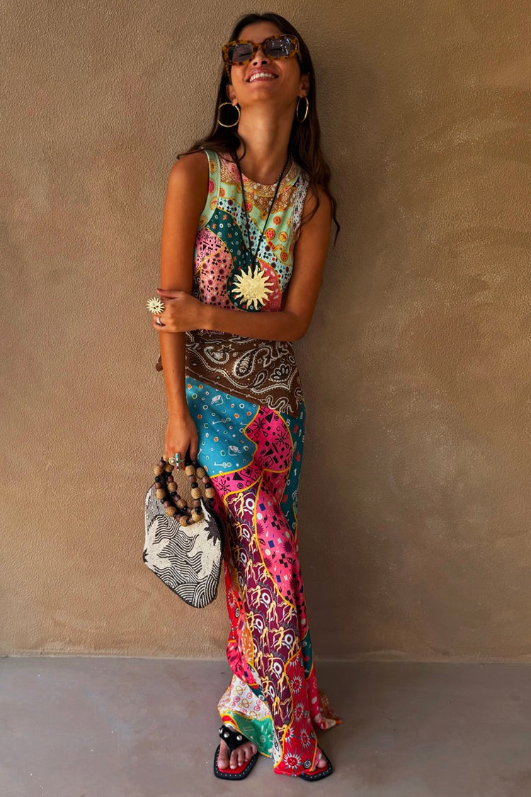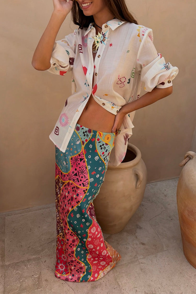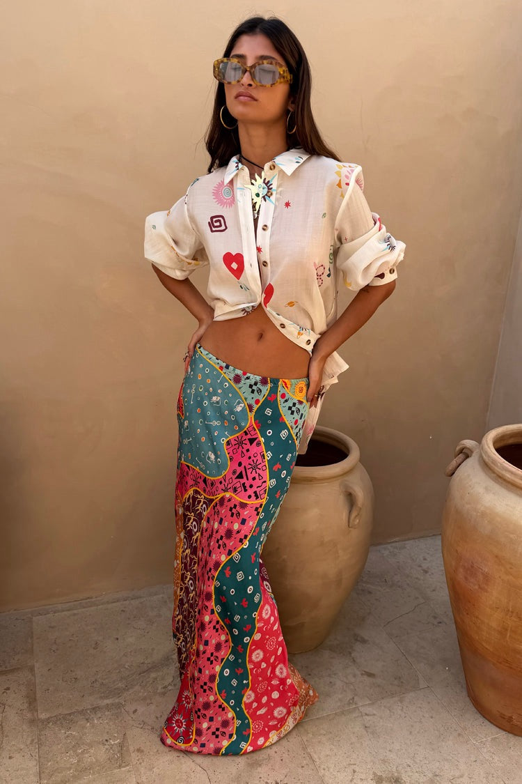 In our new morocco print, featuring our tan sun and a combination of abstract blocks with iconic NFD motifs such as our eye and snakes designs! Pair with a vest or casual tee for an easy day to night outfit!