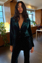 A single breasted blazer made from a buttery soft emerald velvet and studded with little diamonds. The silhouette is designed for a relaxed fit with large side pockets. Style yours with leather trousers and loafers for the office or the matching arden trousers and heels for after work drinks.