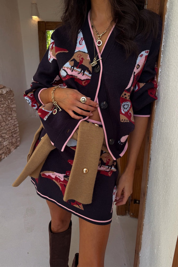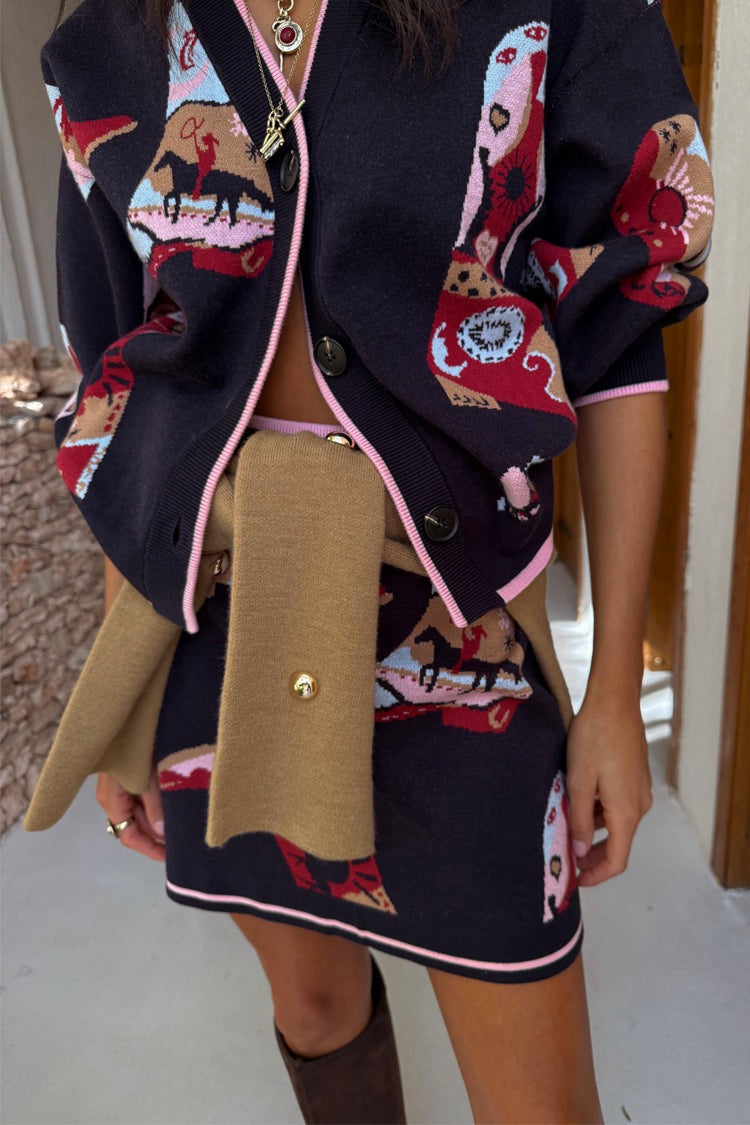 A weighty knit with a soft stretch that makes it feel so premium. Our new cowboy range features cowboy boot and cowgirl motifs, in a range of deep tones, created by our in-house design team. With contrast pink detailing on the hem adding an additional pop of colour, it's the perfect feel good throw on! Complete the look with the matching cardigan for an effortlessly chic co-ord.