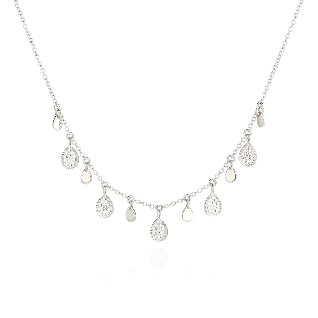 A beautiful sterling silver Teardrop Charm Necklace, adorned with a blend of smooth and dotted charms. Effortlessly delicate and ideal for layering, it's a timeless accessory for every occasion.