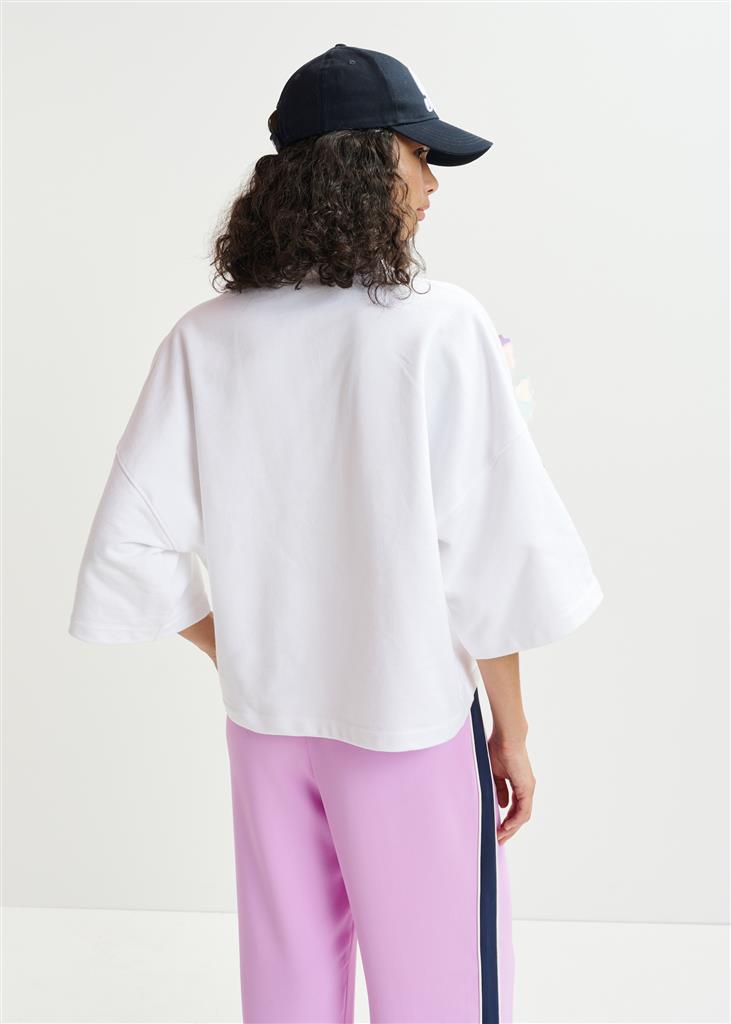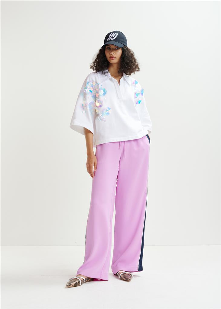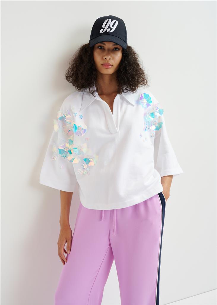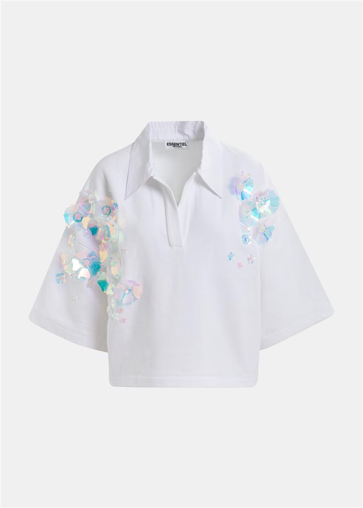 Essentiel Antwerp Harival White polo top with sequin and bead embellishmentsn
