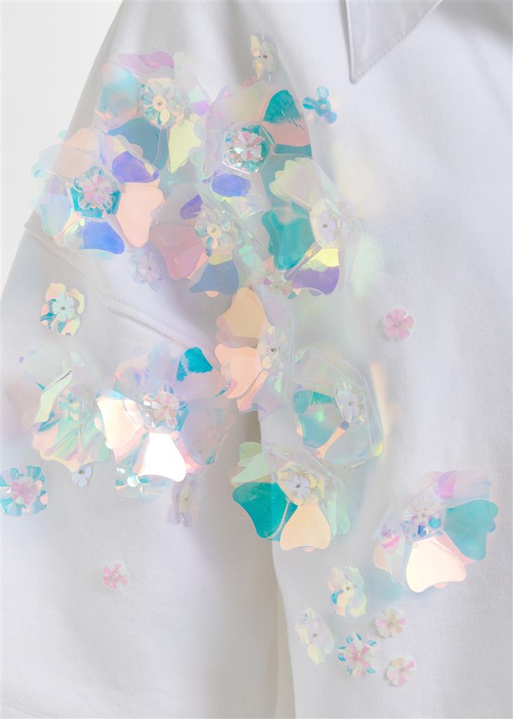 Finely knitted top features a chic polo-style collar, adding a touch of elegance. The collar is adorned with holographic flower sequins and beaded embellishments.
