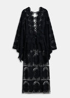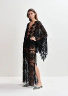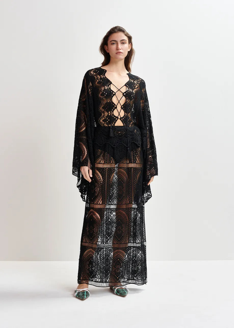 Sheer cotton crochet-knit maxi dress is crafted with intricate patterns and a striking silhouette. Designed with a dramatic front, a peplum waist, and wide batwing sleeves, it brings effortless elegance with a touch of edge. The delicate see-through lace showcases detailed motifs, while the scalloped hem adds an extra layer of refinement. Perfect for layering over swimwear or a slip for an unforgettable evening look.