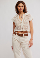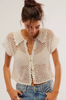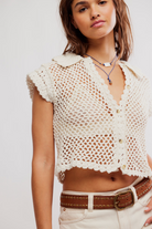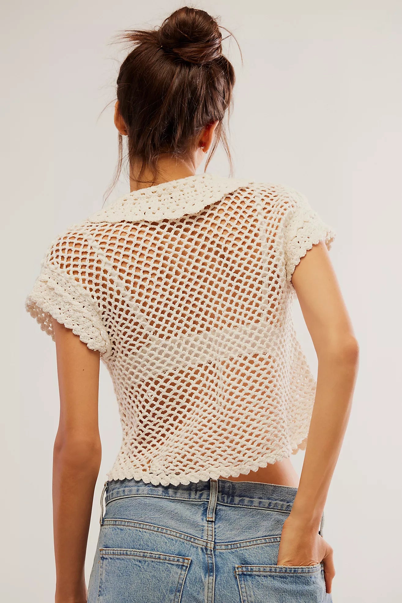 So cool in crochet, this effortlessly easy top is featured in an open-knit fabrication and slightly cropped fit with a collared neckline and scalloped trim.