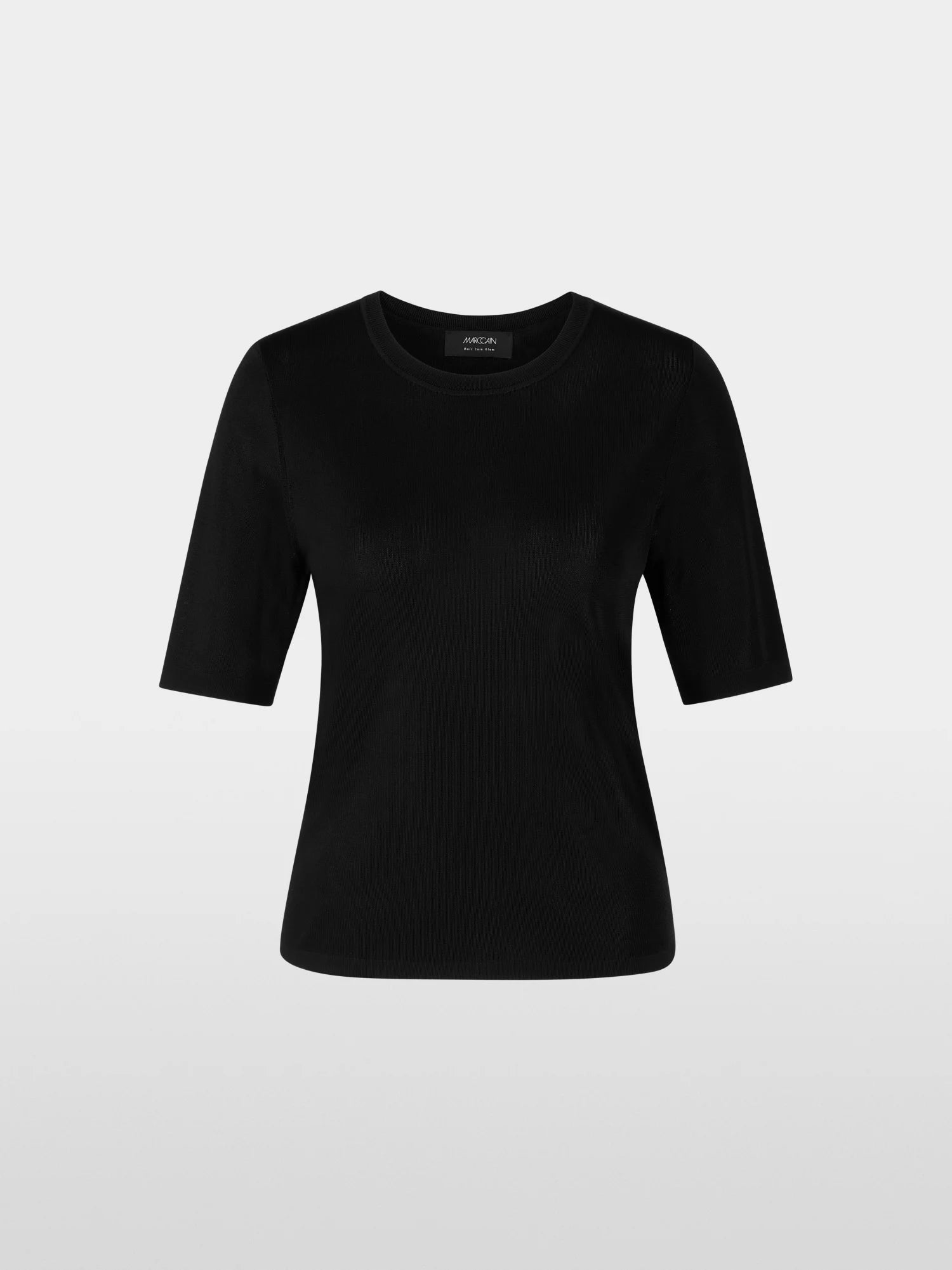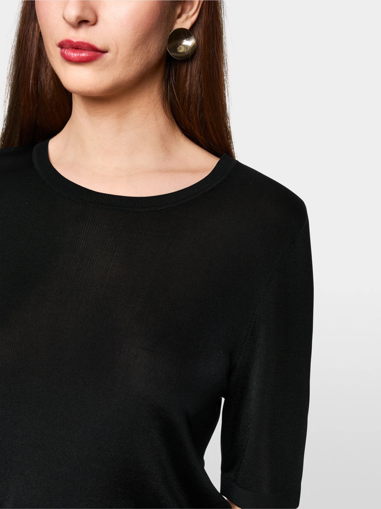 This short jumper is made of lightweight viscose and is pleasantly soft to wear. The material has a slight sheen. This jumper has a round neckline and a figure-hugging cut.