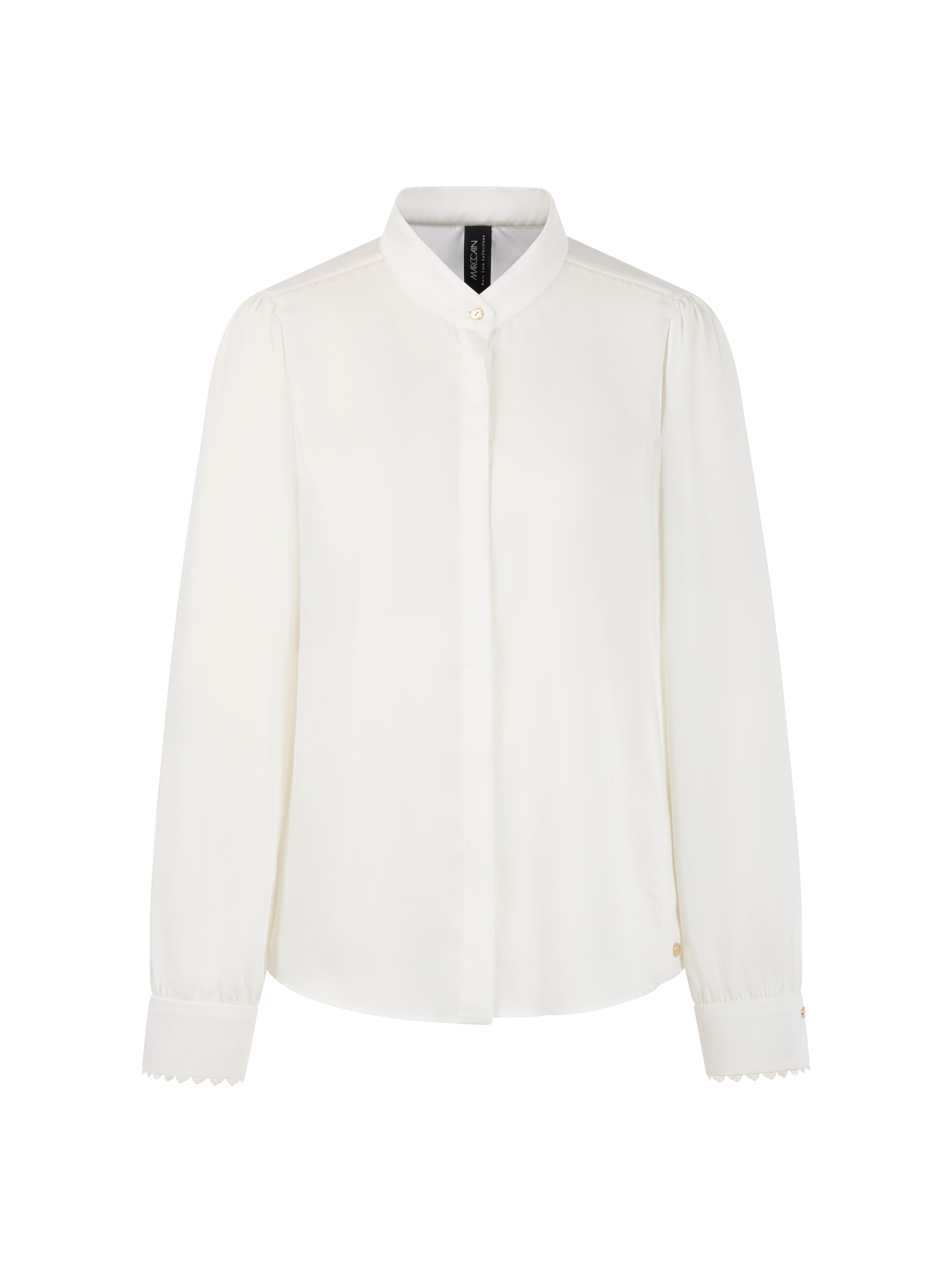 Blouse with lace and stand-up collar|Soft, flowing blouse with a concealed set of buttons and an elegant stand-up collar that fastens with a gold button. Fine lace details on the shoulders and cuffs give the design a feminine and elegant touch. A stylish companion for modern, elegant looks.|Loose cut|With concealed buttoning|Stand-up collar|Flowing quality|The model is 179 cm tall and wearing size N3 / UK 12.