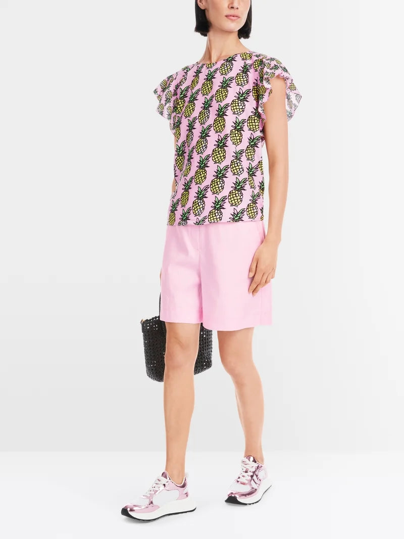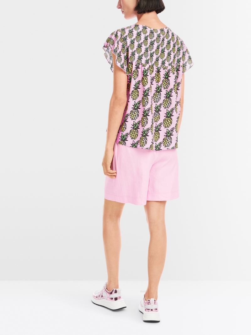 Printed all over with pineapples, this blouse attracts attention. It has a loose cut with a ruffled back and a round neck. Short frilled sleeves emphasise its playful design. Made from an especially light cotton-viscose blend, this slip-on garment is from the Rethink Together sustainability label.
