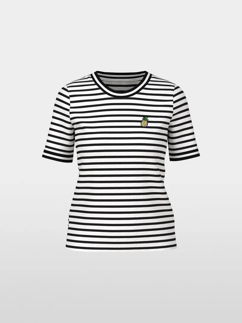 The T-shirt features a cheerful all-over striped design. The pineapple appliqué on the left chest is an eye-catching feature. This item has a figure-hugging fit, a round neckline and short sleeves. Its soft stretch cotton fabric makes it the ideal summer basic.