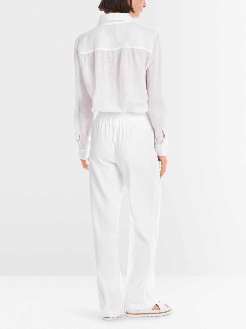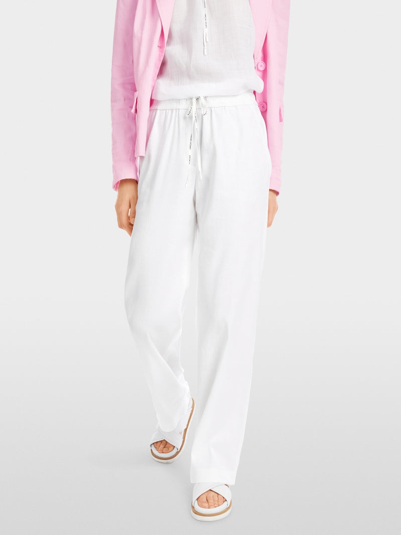 With their fine material blend of linen and cotton, the WASHINGTON trousers have an airy summery touch. These trousers have a wide leg in a regular length. The waistband is smocked at a regular height and can be individually adjusted using the cord featuring the Marc Cain Sports lettering. Side pockets complement the casual style.
