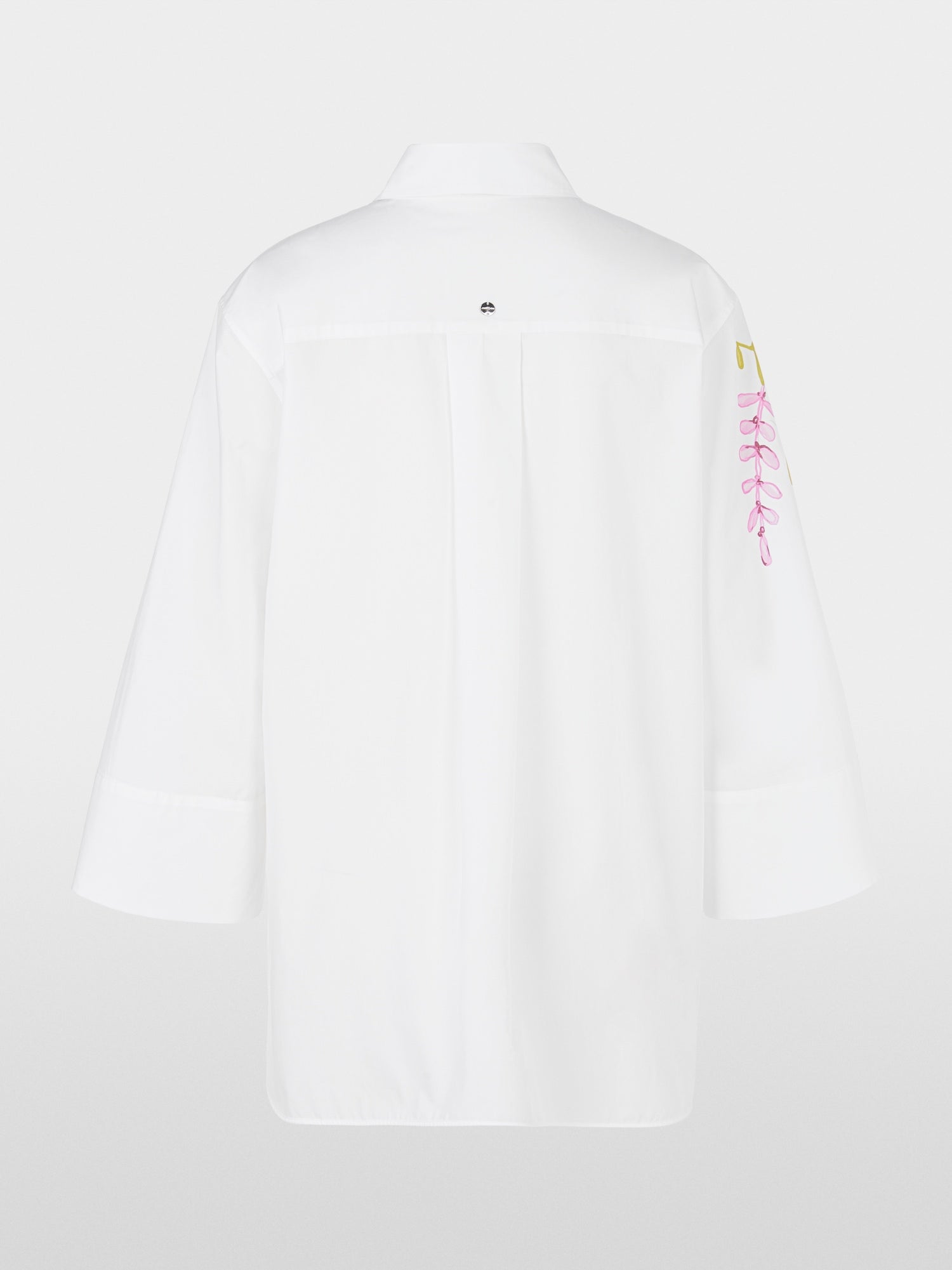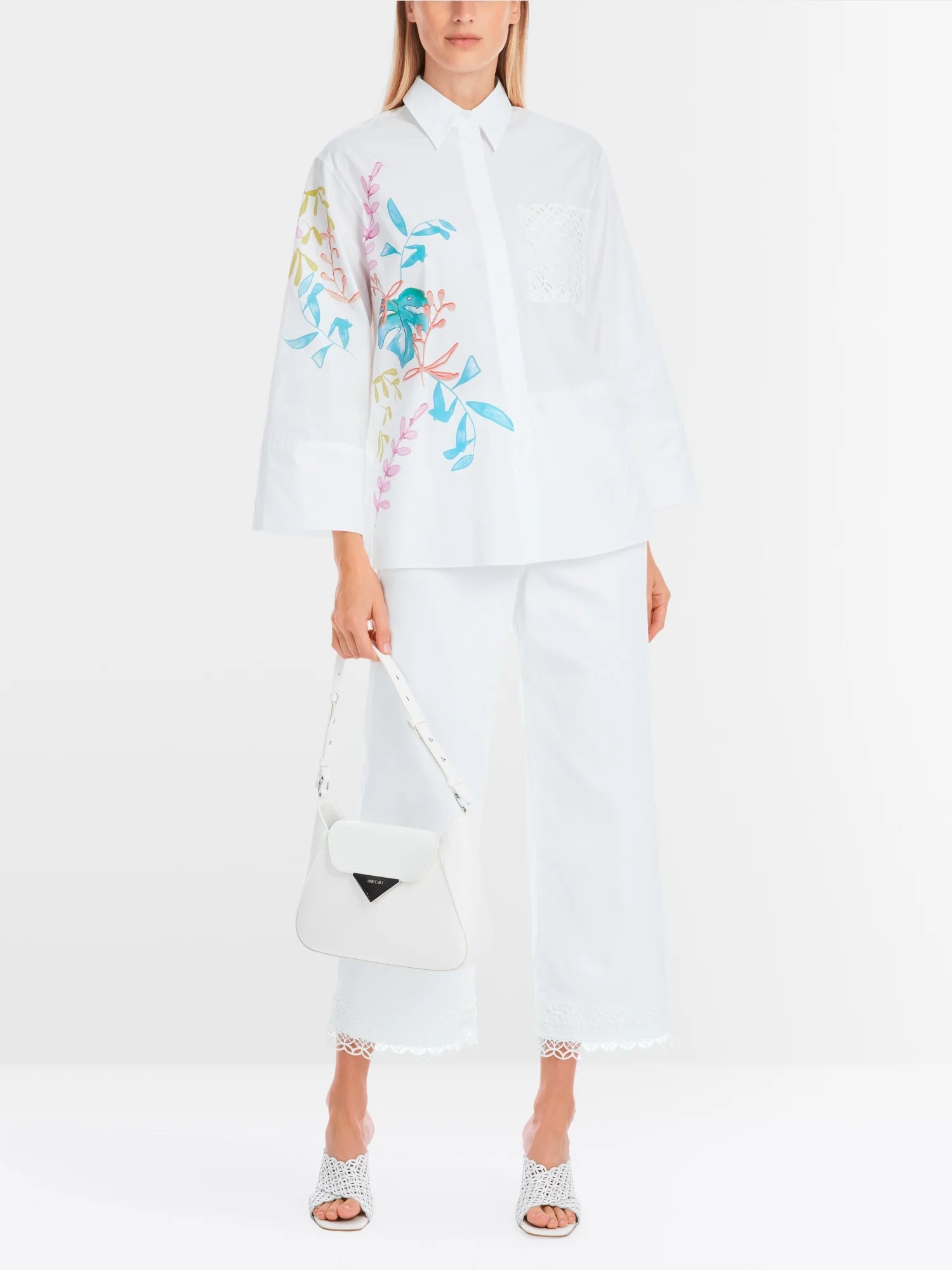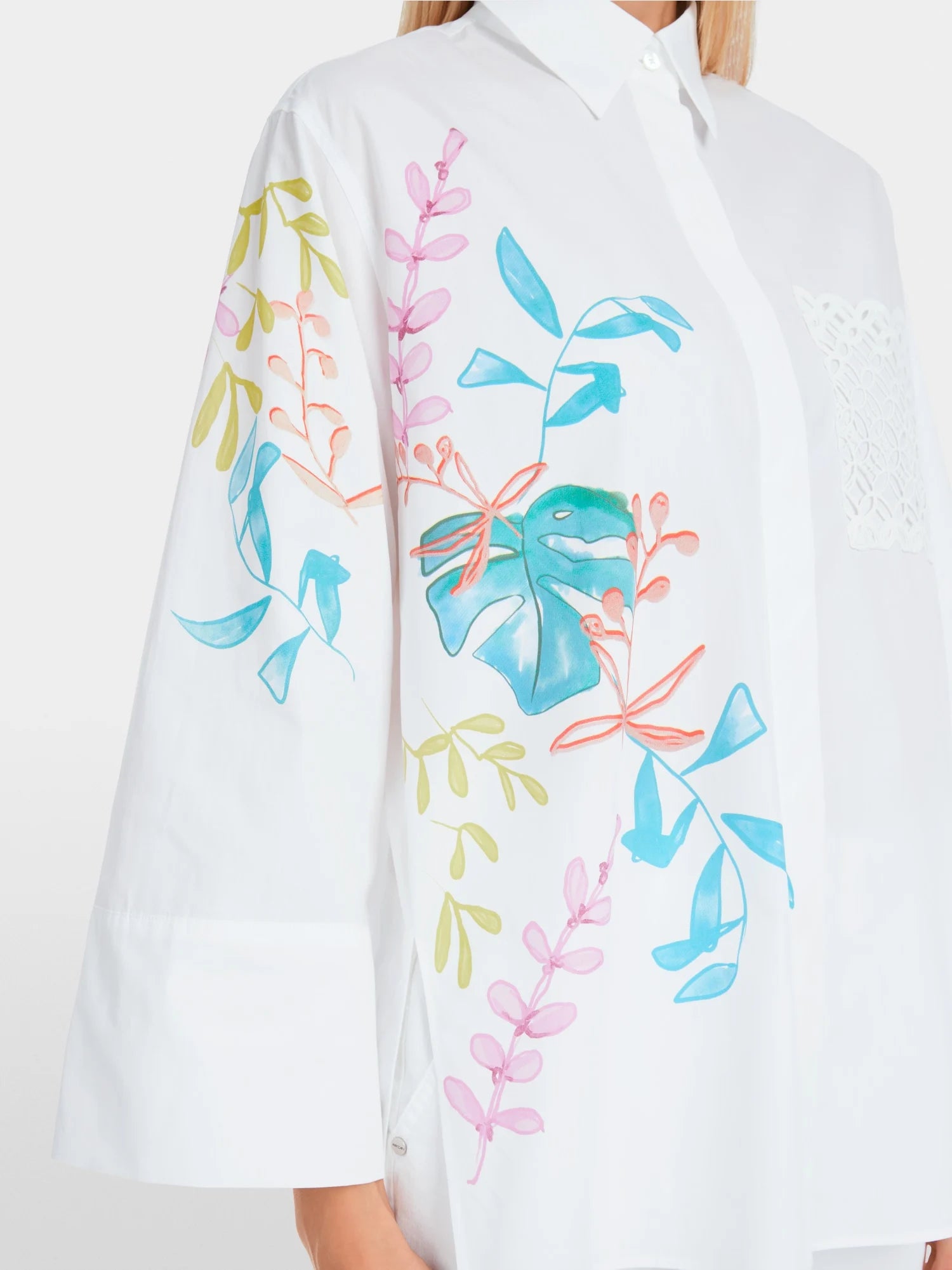 Oversized shirt blouse in 100% organic cotton. Its shoulders are dropped, the hemline is rounded towards the sides and its back is slightly longer. Eye-catching features: the chest pocket in perforated lace and the asymmetrically positioned print with a leaf motif.