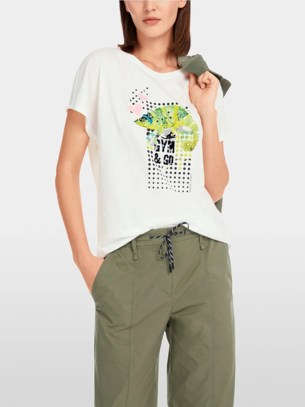 T-shirt made from 100% cotton. This garment has a wide, boxy shape and a suggested kimono sleeve. The animal motif on the front is a real eye-catcher. The print is partially embroidered with sequins and beads.