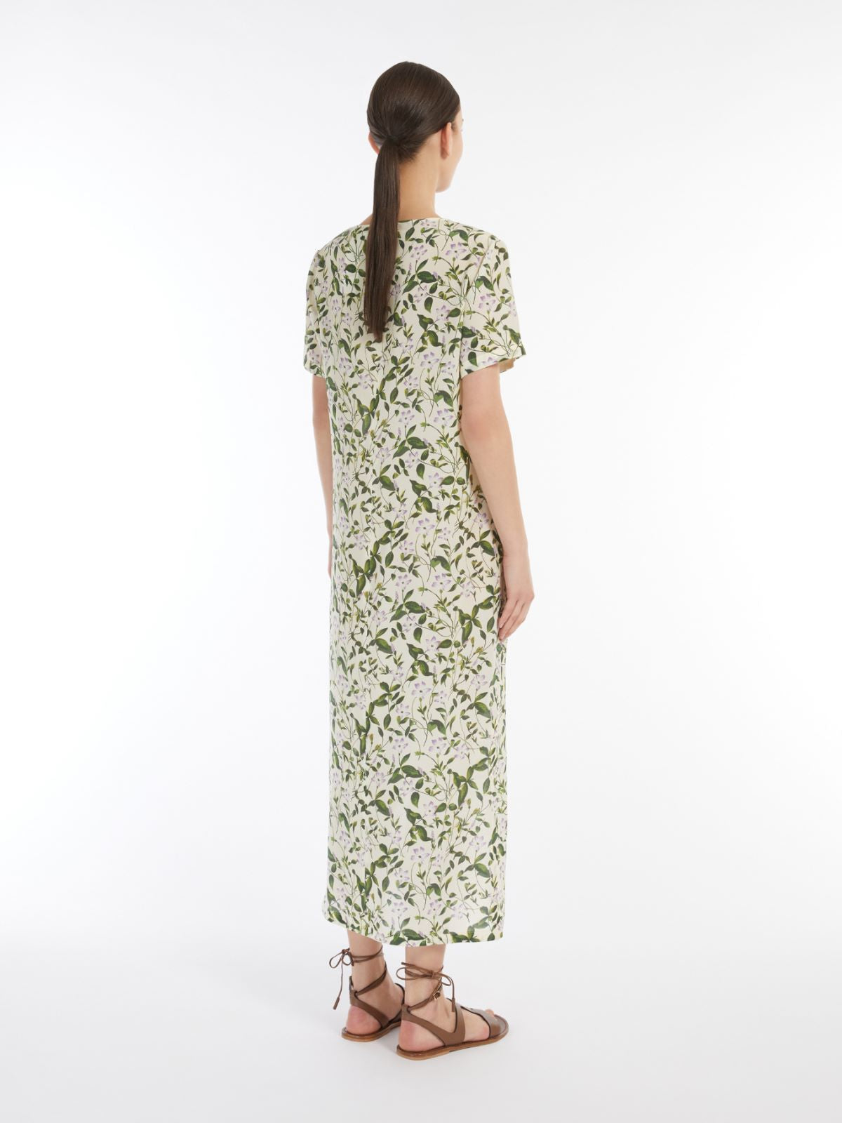 Long dress in luxurious pure printed silk crêpe de Chine with a round neck and short sleeves. Unlined style with a straight and flowing line, finished with side slits and a teardrop fastening with a small button at the back of the neck.