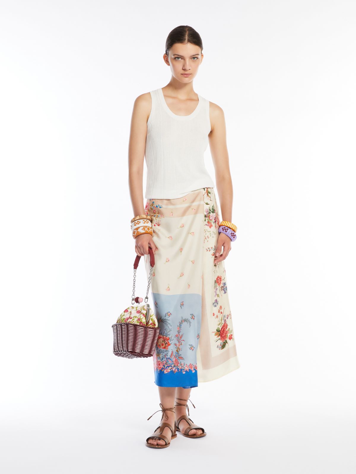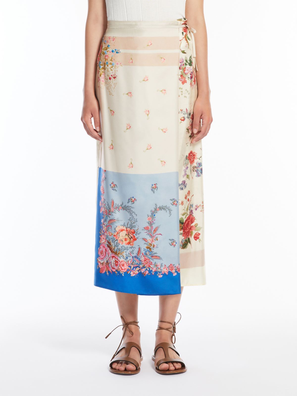 Midi wrap skirt, made of luxurious pure silk twill, with a foulard-inspired patchwork print. Unlined straight-cut style, featuring a panel construction with ties to fasten at the waist and a slit in the hem at the front.